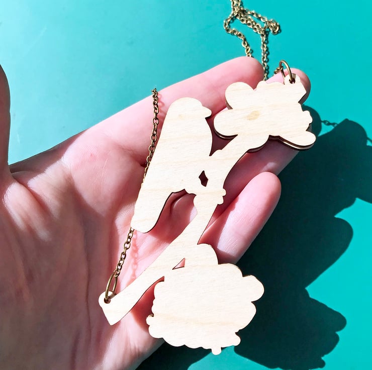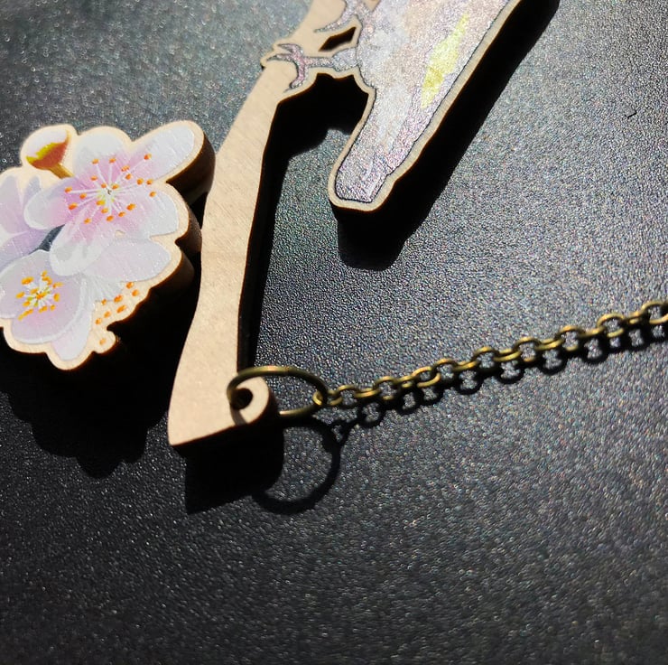 Each necklace is made from responsibly sourced 3mm European Birch Plywood. The wooden necklace is attached to an antique bronze cable chain measuring approx. 19.5". The wooden necklace is approx. H - 8.1 cm (3.2") W - 9.5 cm (3.7") and D - 0.6 cm (0.24") where the cherry blossoms stand proud.