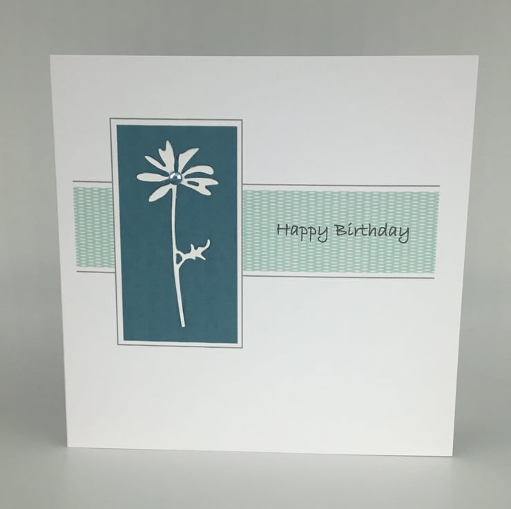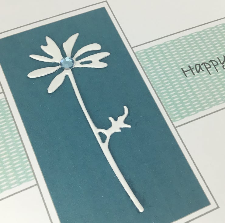 It has been printed on quality, 300gsm card, measuring approximately 15cm, or 6 inch square. The flower is cut from crisp white card and has been further embellished with an adhesive gem in the centre.