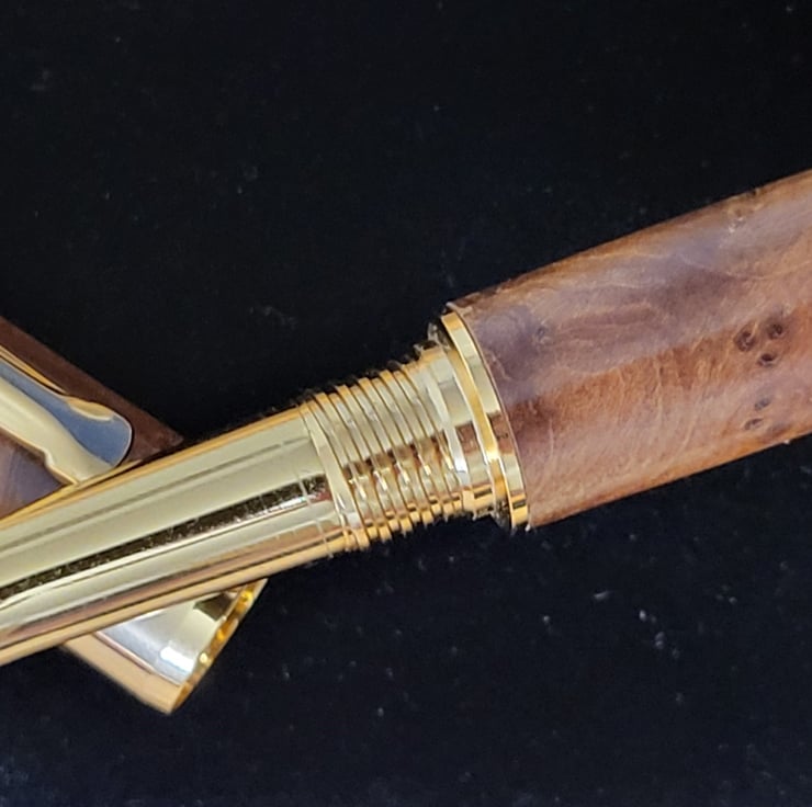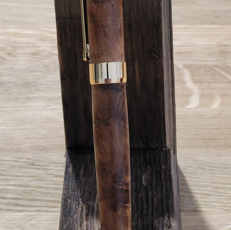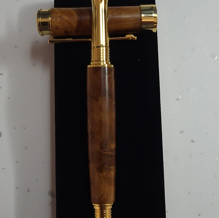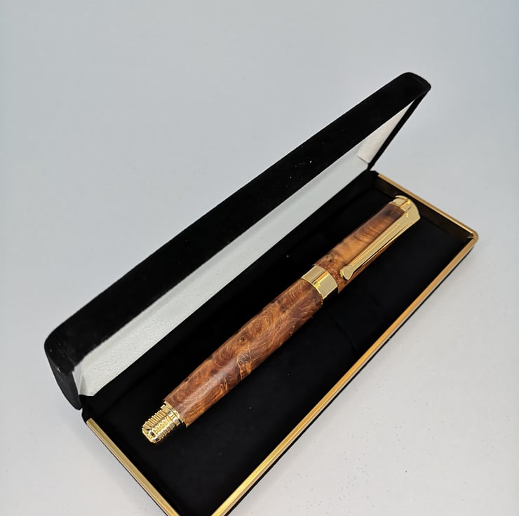 A deluxe fountain pen made using aromatic Thuya Burr with gold finials and nib housing. Turned, sanded and burnished to bring out a richer colour, the wood was sealed and finished with melamine lacquer for a hardwearing and durable finish. The nib is a medium IPG nib and writes very smoothly. I use a similar pen for work which has a nice feel and balance. You can post the cap on the finial if you choose when writing. The pen is supplied in the velvet pen box shown in the pictures and also comes with two international style ink cartridges (not Parker) and an ink converter if you prefer to use bottled ink.