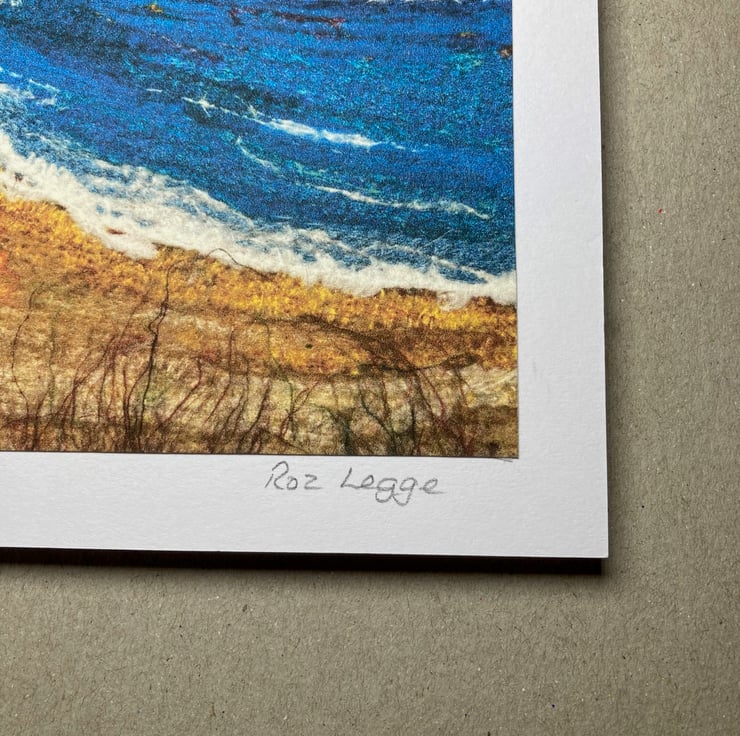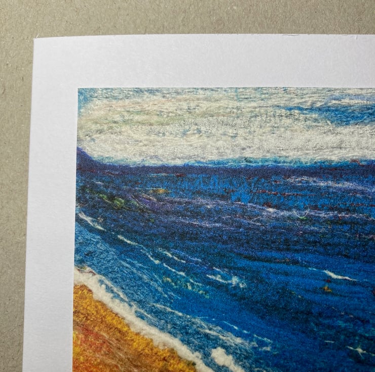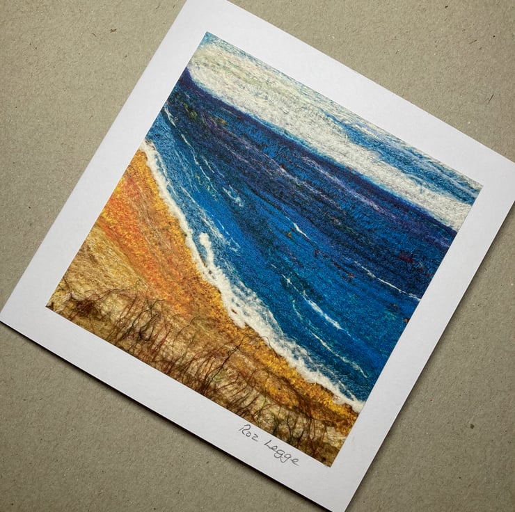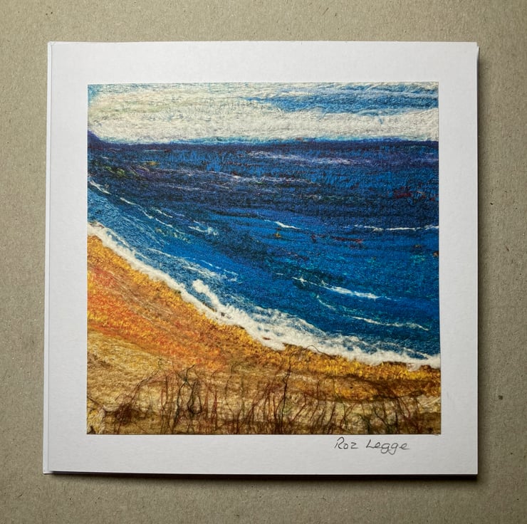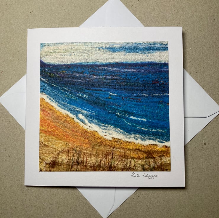 A gently curving beach with a choppy sea. The image used on this card is a print made from a photograph of an original piece of my textile art. The photograph has been printed onto good quality cartridge paper and mounted onto a white folded card that measures 5" x 5". The image captures the texture of the original piece. The original textile art piece consists of silk fabric pieces and various silk and wool fibres needle felted together to form the picture. The card has been left blank for your own message and is supplied with a white envelope.