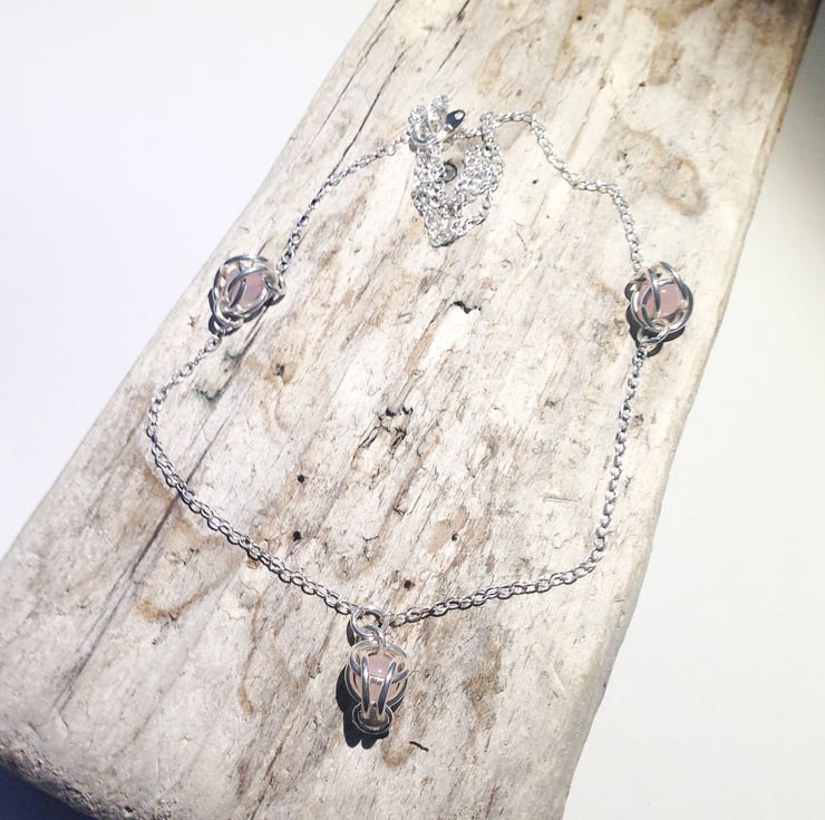 I have created this elegant necklace from handmade bead cages containing beautiful little rose quartz beads combined with sterling silver chain.