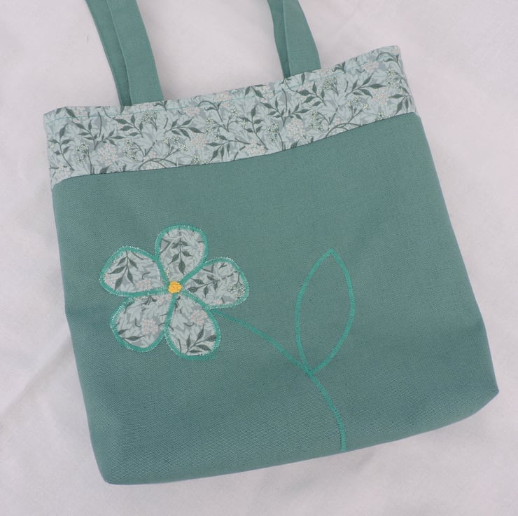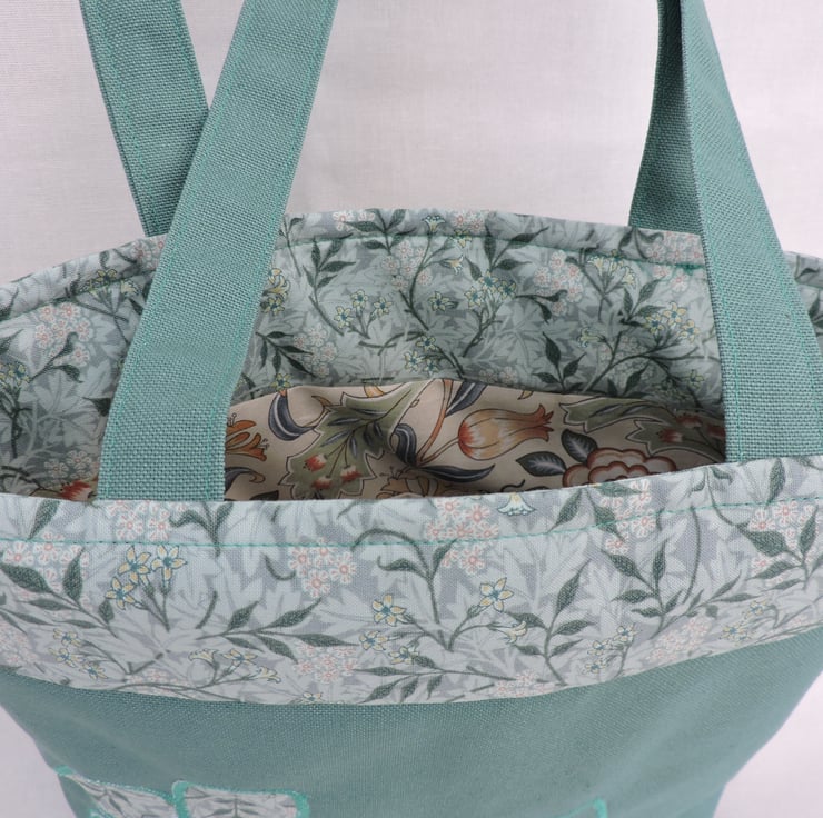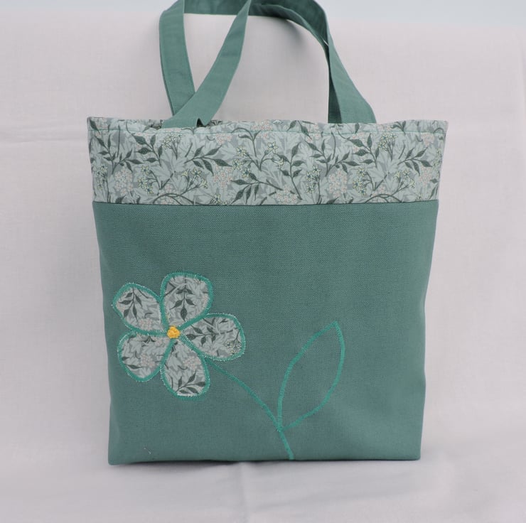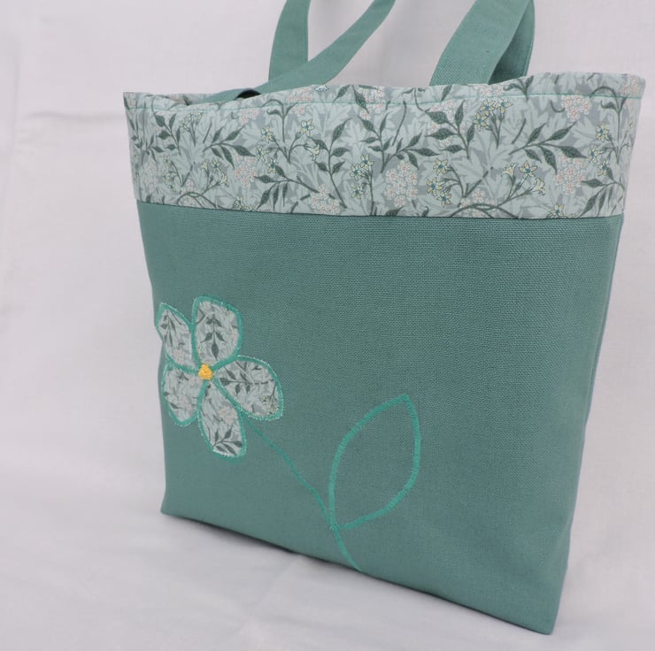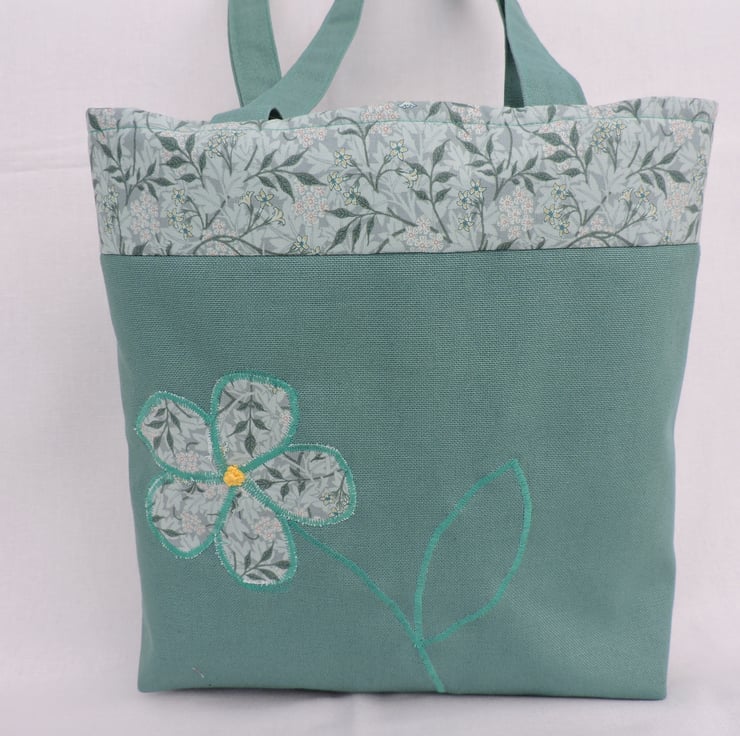 For this handy tote bag I have used a sea green cotton duck fabric for the bottom section of this bag also for the handles, the top of the bag and the appliqued flower are in a complimentary green cotton floral fabric. Lined with a floral cotton fabric, it also has a inner pocket. It has a squared off bottom and has interfacing to add stability.