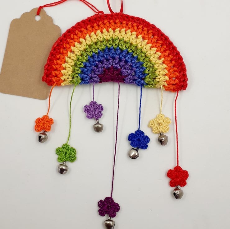 This bright hanging decoration would make a novel keepsake alternative to a greetings card. The rainbow and flowers are crocheted in cotton. The rainbow is lined with a double layer of sturdy felt. There is a silver bell beneath each flower to add useful weight and to represent a raindrop ( bear with, it all makes perfect sense in my head!)