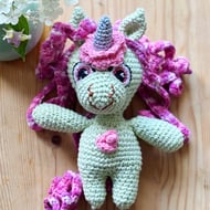 She is safely constructed from acrylic fur yarn and features plastic safety eyes. She has a cotton beak and feet.