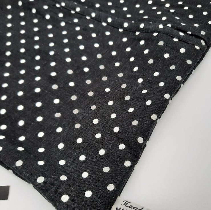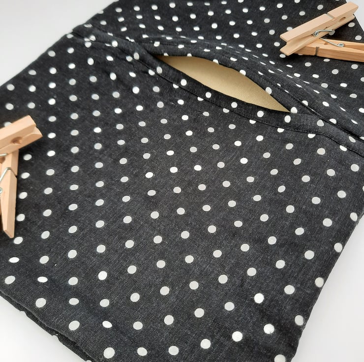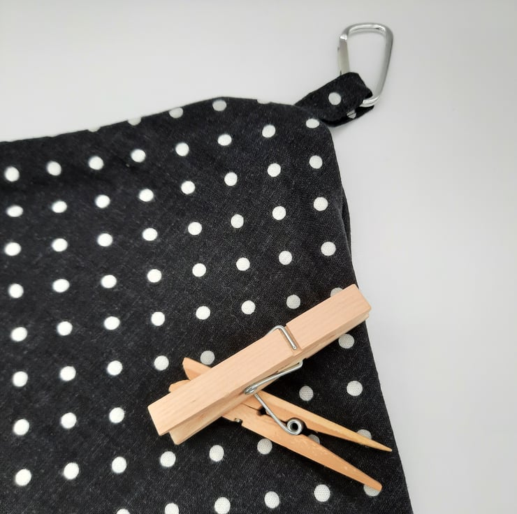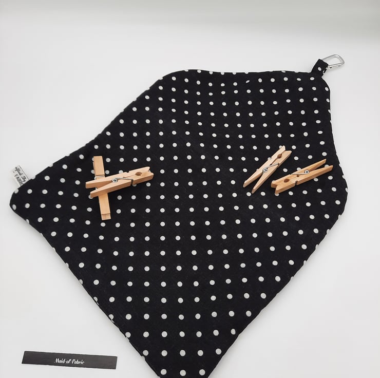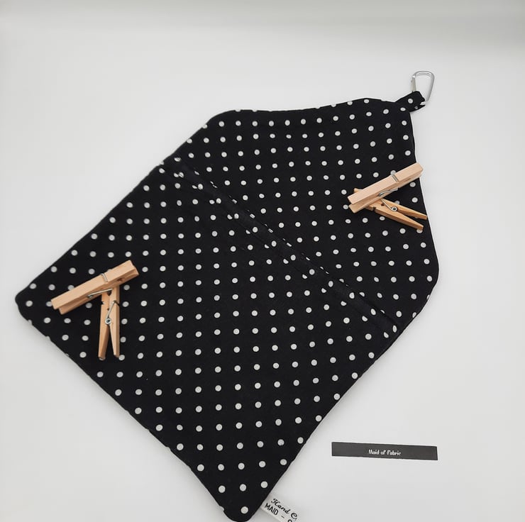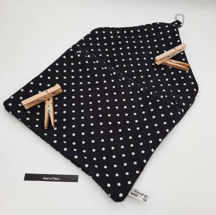 Peg bag made using a black and white polkadot cotton fabric. Lined with a cream cotton.