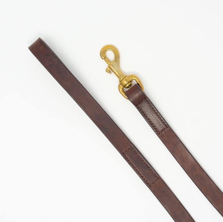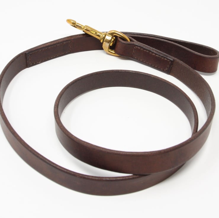 This plain leather dog lead is made using dark brown quality Italian leather. The edges are bevelled and burnished smooth so that there are no rough edges to catch on either you or your dog. The clip is a solid brass swivel trigger hook fastener.