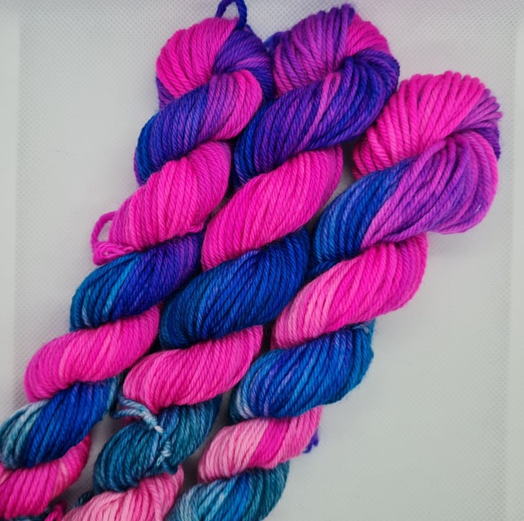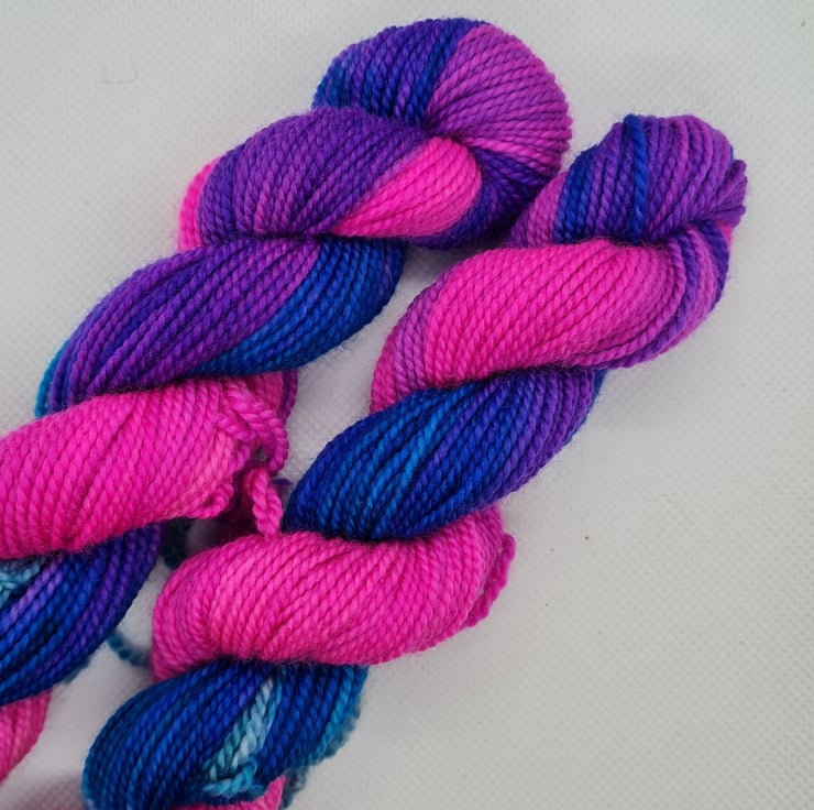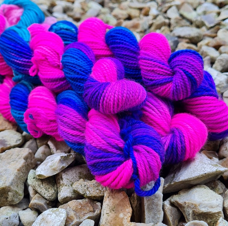 Hand dyed 20g mini skein of yarn. Teals, purples and pink colours