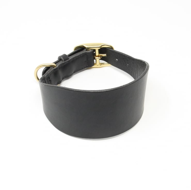 This traditional style leather greyhound / whippet collar is made from quality Italian veg-tanned leather and has a solid brass buckle and D ring. A lot of attention has been made to the stitching to make sure there are no bits of the collar where hairs or skin could get trapped. All the edges have been carefully bevelled and burnished as well - this gives a lovely smooth finish. The collar comes in a choice of dark brown, tan or black.