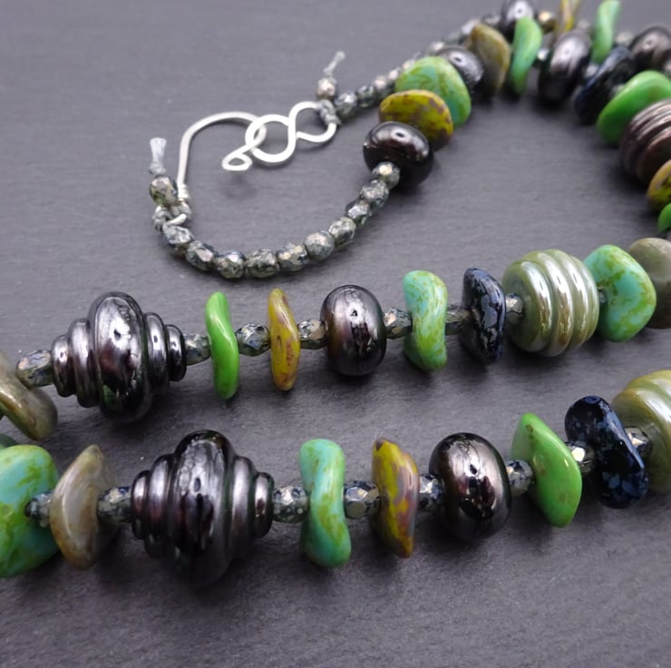 The lampwork beads have been handmade by me using grey/silver and green/silver glass.