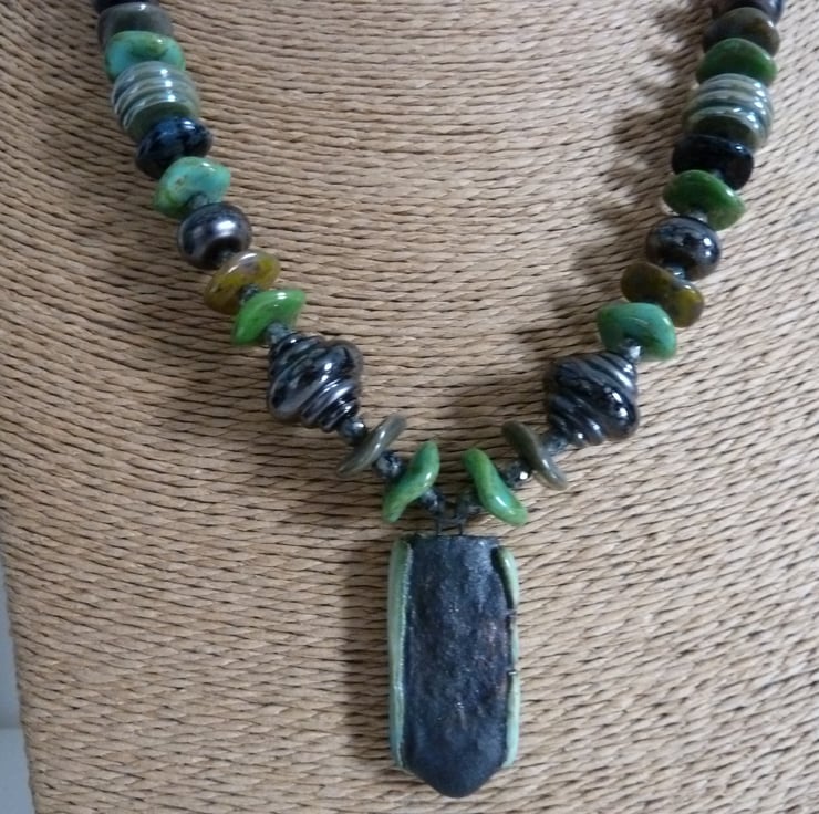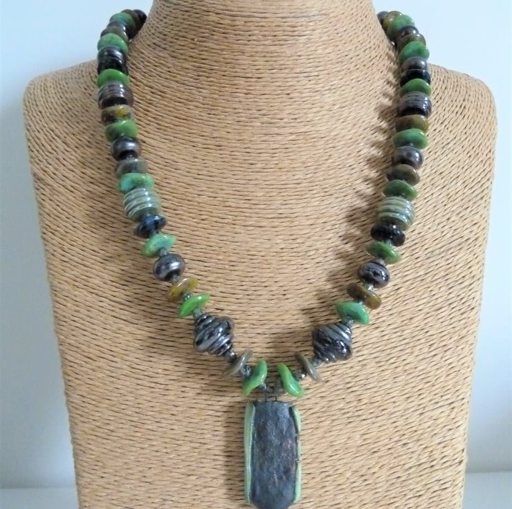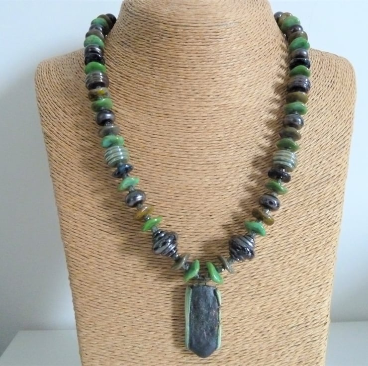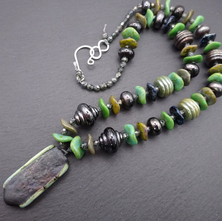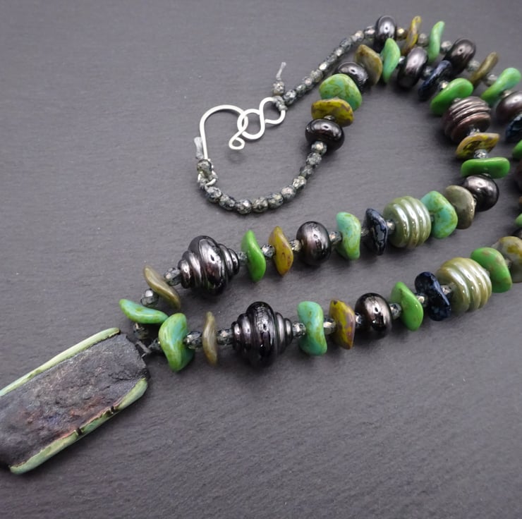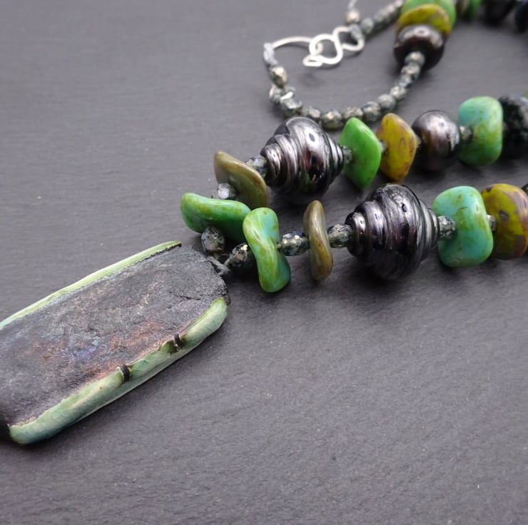A necklace made with handmade lampwork glass beads and Czech glass beads. It features a handmade ceramic pendant and fastens with a handmade sterling silver hook.