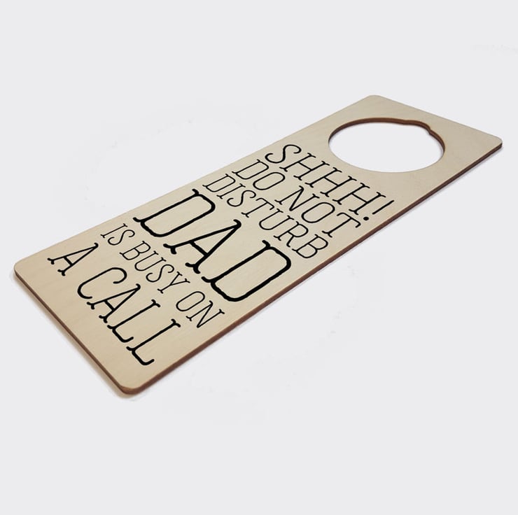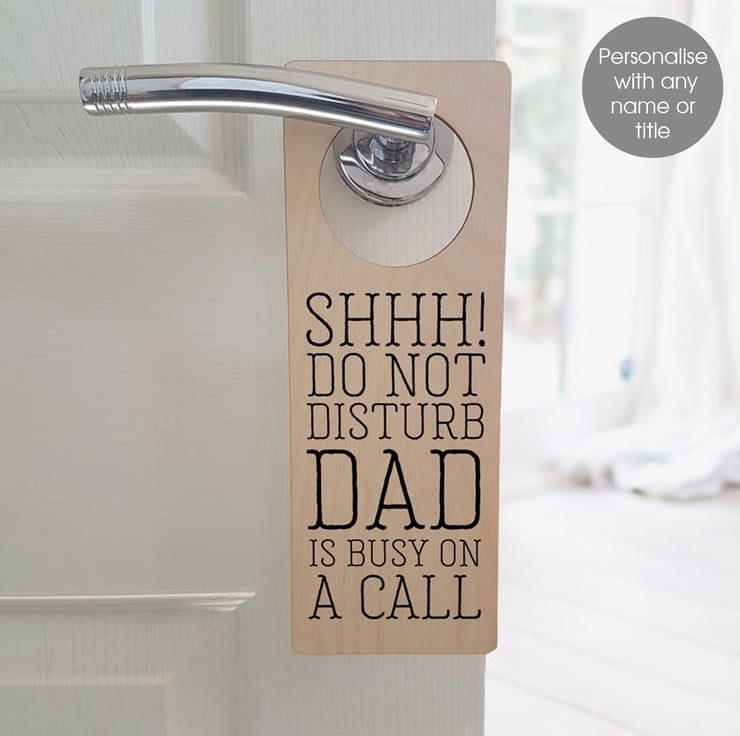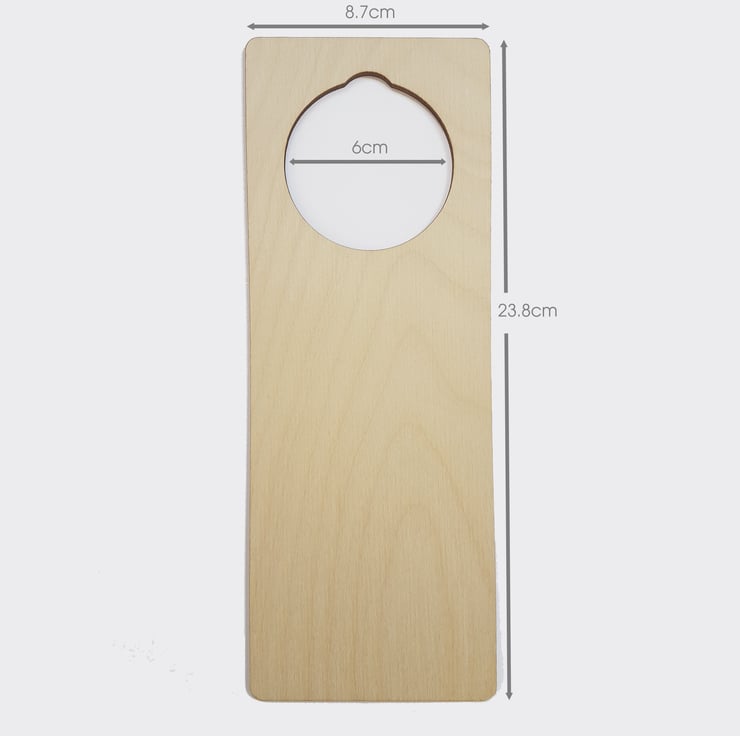 This personalised wooden door hanger is made from natural birch wood and measures approximately 87mm wide x 238mm tall, and the opening hole measures 60mm diameter. The hanger is 3mm thick. The lettering on the sign is black. The door hanger can be personalised with any name or title - eg 'Jane', 'Dad', etc (10 characters max, inc spaces between words - longer names will feature the ornate scroll line).