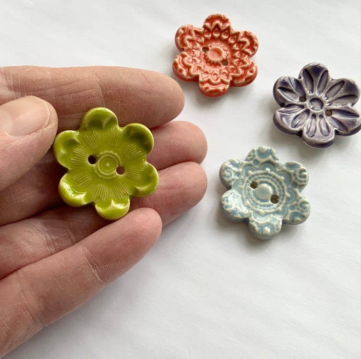 This set of four flower shaped pottery buttons are made from white earthenware clay, embossed and glazed on the front. They are then fired to 1100 degrees, so nice and strong. They measure 2.8cm. They can be handwashed or machine washed on a low temperature. Perfect for all sorts of arts and craft projects
