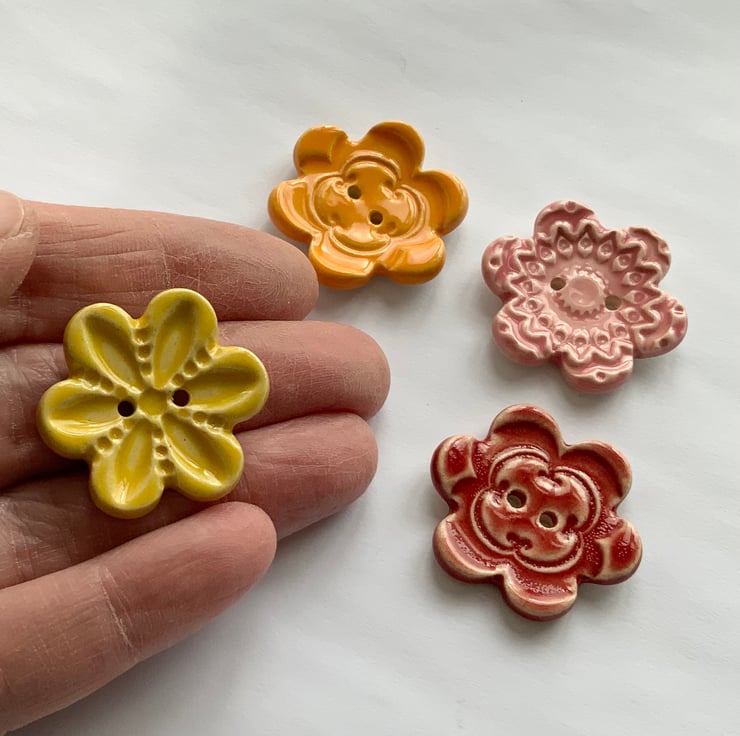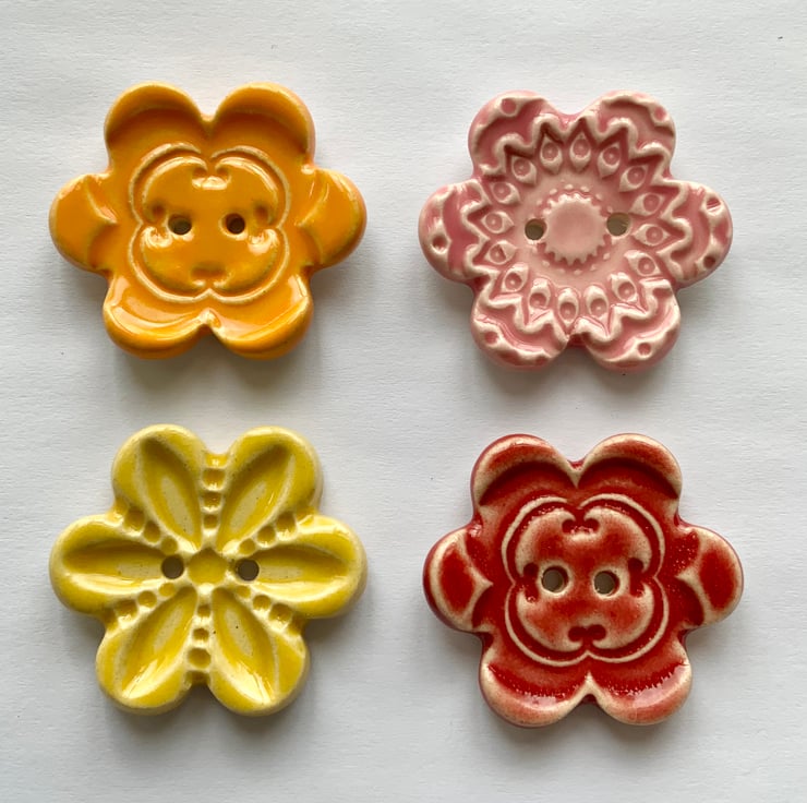 This set of four flower shaped pottery buttons are made from white earthenware clay, embossed and glazed on the front. They are then fired to 1100 degrees, so nice and strong. They measure 2.8cm. They can be handwashed or machine washed on a low temperature. Perfect for all sorts of arts and craft projects