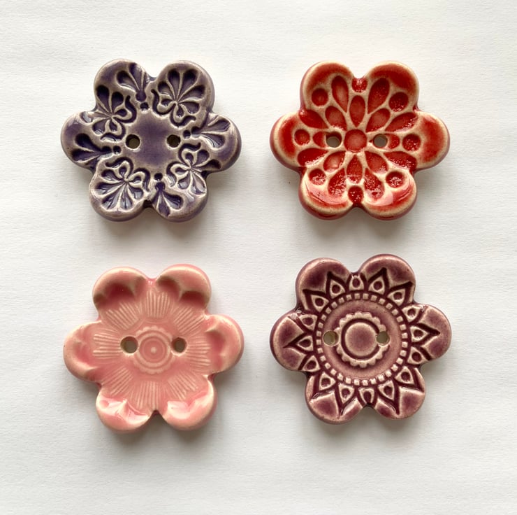 This set of four flower shaped pottery buttons are made from white earthenware clay, embossed and glazed on the front. They are then fired to 1100 degrees, so nice and strong. They measure 2.8cm. They can be handwashed or machine washed on a low temperature. Perfect for all sorts of arts and craft projects