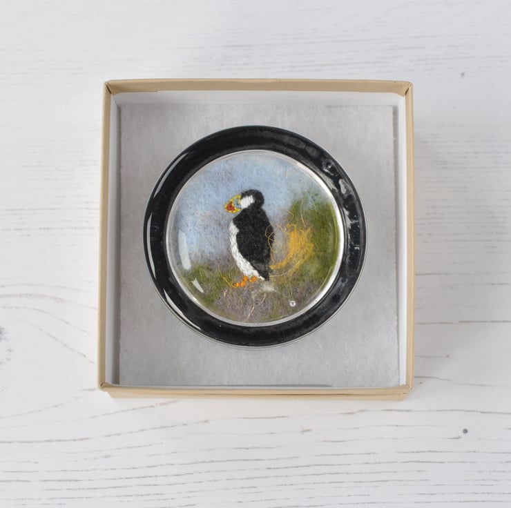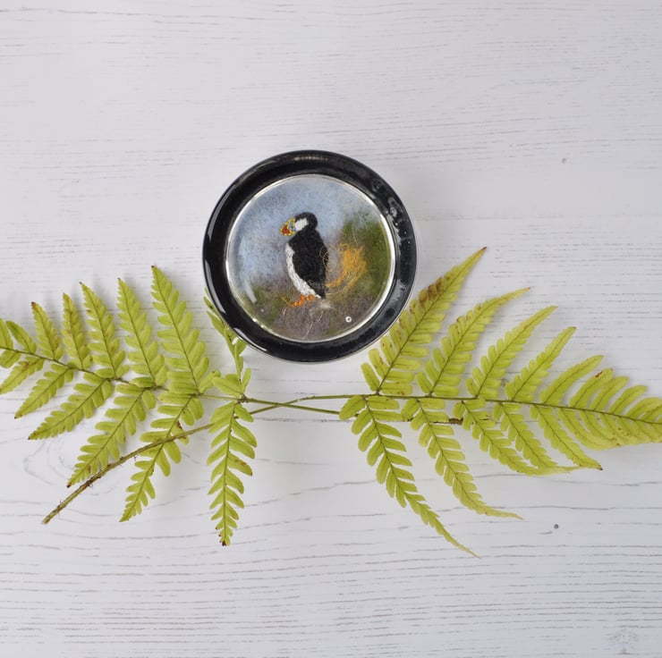 Puffin embroidered paperweight with a needle felted background.