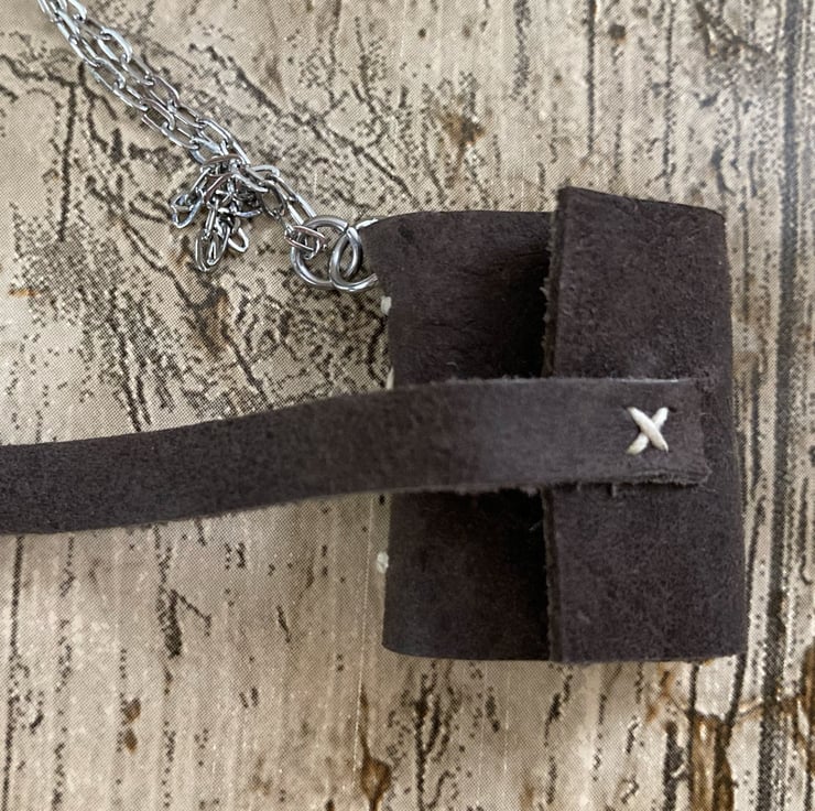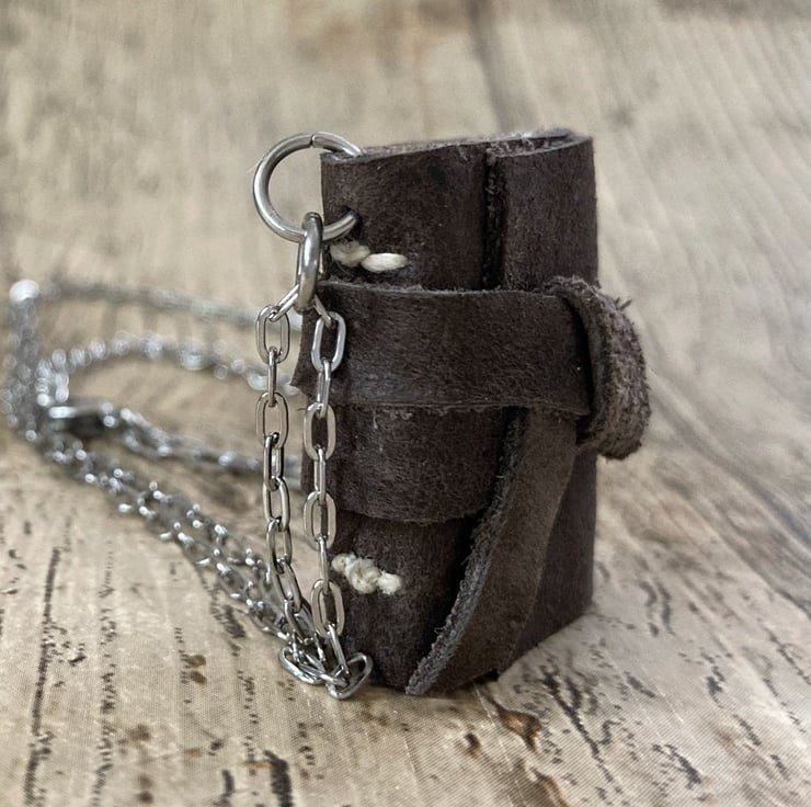 Each mini journal contains 64 sides of beautiful handmade 100gsm cotton rag paper, hand torn to size. Each page measures approximately 1" tall X 3/4" wide. When the book is closed, the pendant measures approximately 1 1/4" tall X 1" wide X 1/2" deep. The pages are hand bound into a tiny leather cover in your choice of colour, using waxed linen thread. The journal hangs from a stainless steel chain with an optional 2" extender chain and secures with a lobster clasp. For your reference, the necklace in the image being worn hangs from a 20" chain.