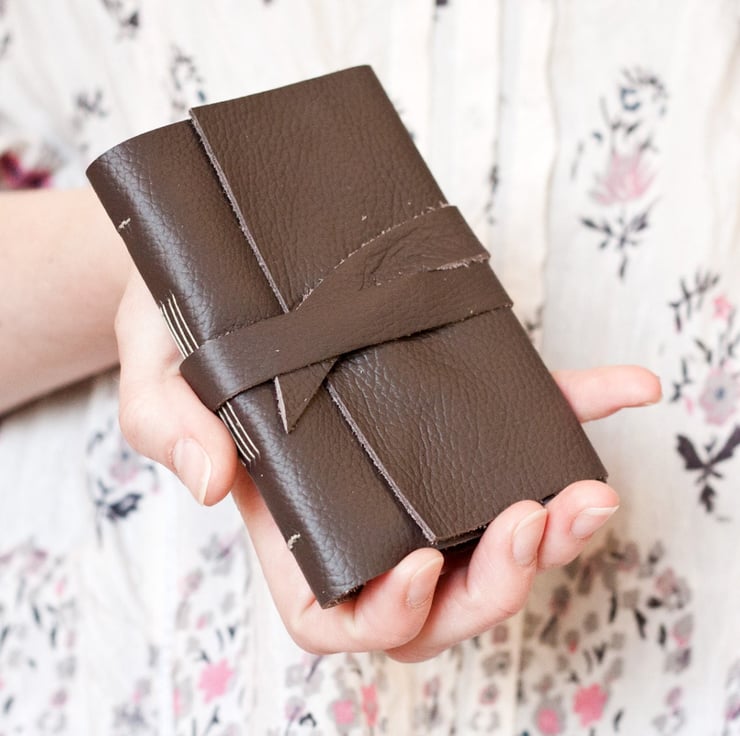 The best little companion - these mini leather journals are so adorable - they're A7, 4x3" in size and will fit perfectly in to even the smallest of bags or pockets! Perfect for on the move, each mini journal contains 80 pages, hand bound into a soft leather cover in your choice of colour. They each secure using a slither of leather attached to the cover flap which wraps around the books and tucks in neatly to keep your work safe and sound.