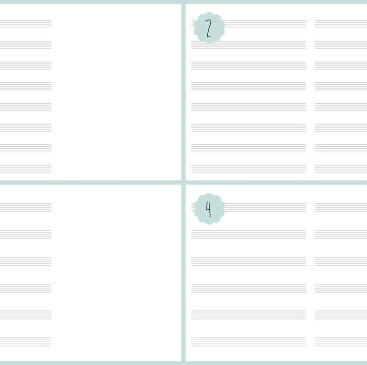 6 staves on every other page (your book will begin with a blank page).