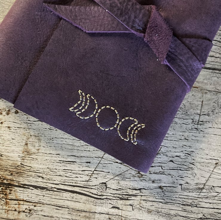 Part of my hand embroidered celestial collection - this lunar phase design is hand-sewn into your colour choice leather journal. The embroidery measures approximately 1 34" wide by 12" tall