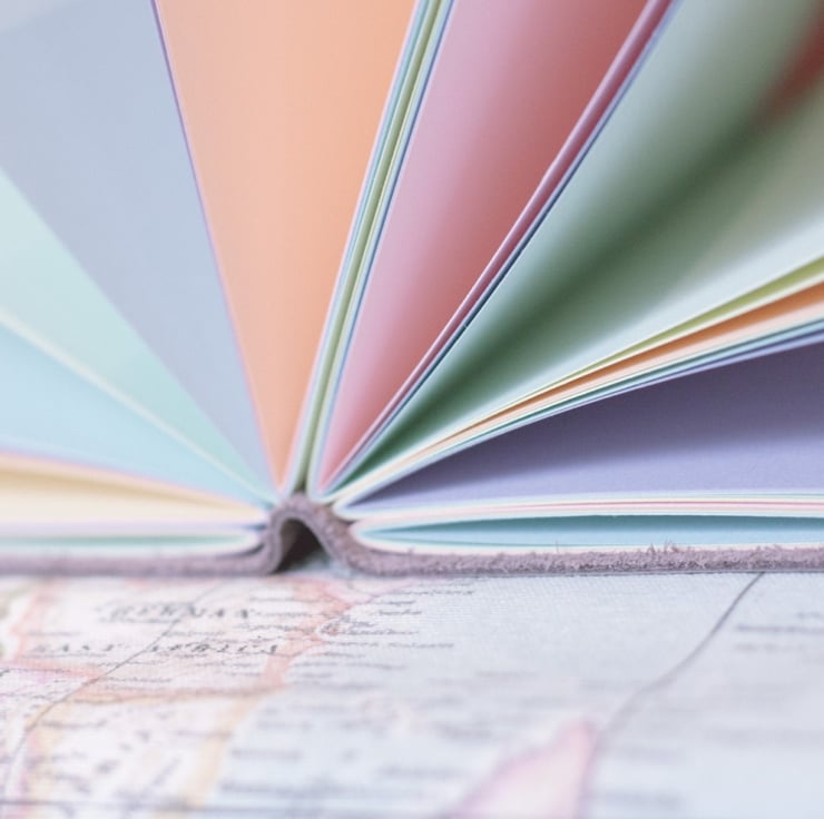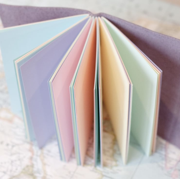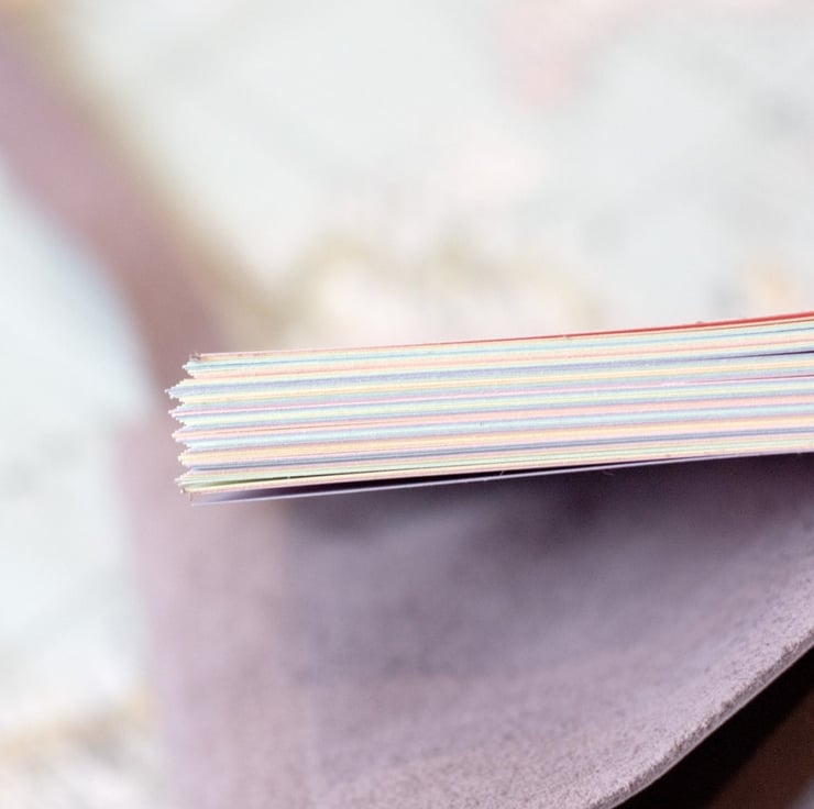 - 120 pages (counting front and back) of 6" x 4" silky smooth 160gsm card in an array of six beautiful colours, scattered throughout the book.
