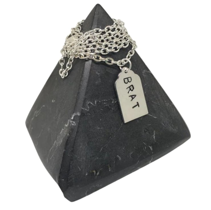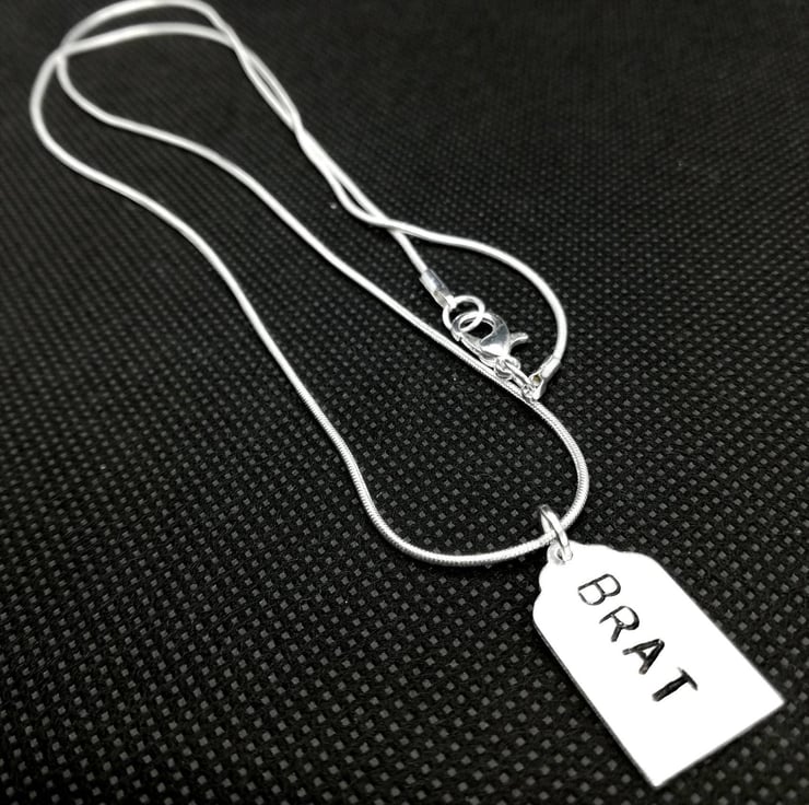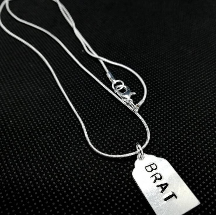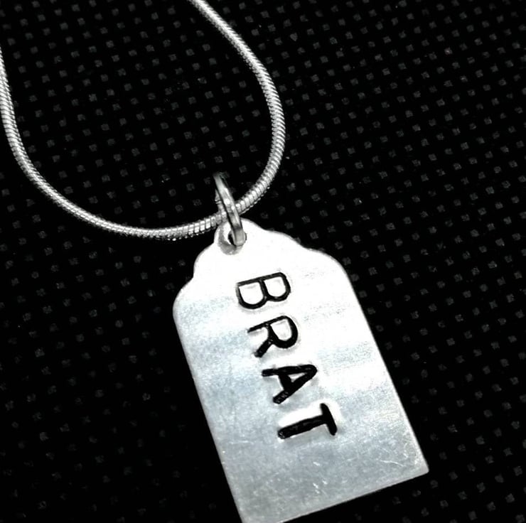 Necklace, hand stamped Aluminium Luggage tag shape 20.7x12.4mm, Stamped with the word "BRAT".