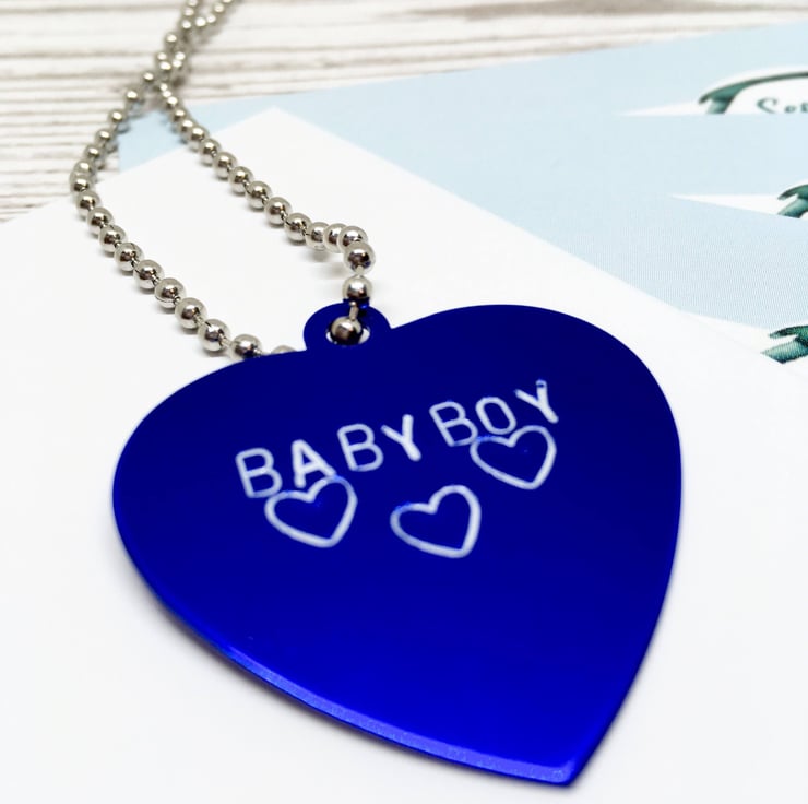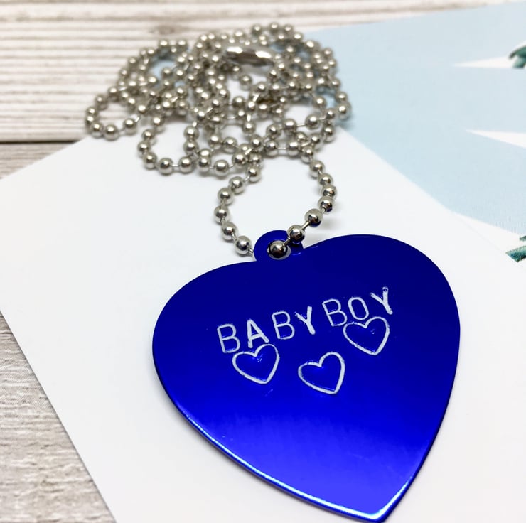 Stamped with the words "BABY BOY" strung on a 26 inch black ball chain,