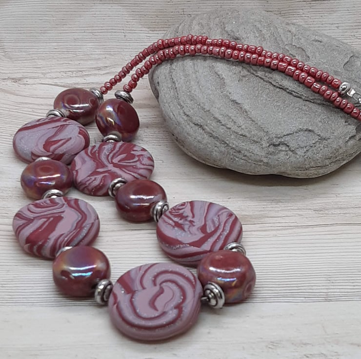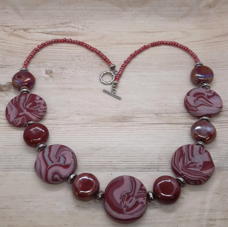 This vibrant necklace features handmade beads in chilli red, dusky pink and silver polymer clay blended together to create a unique swirl design with a hint of sparkle.