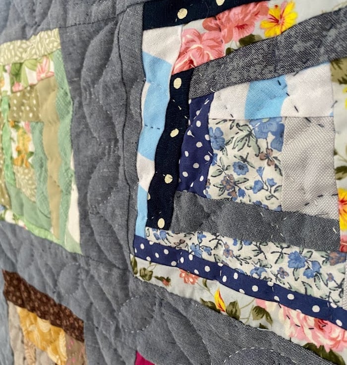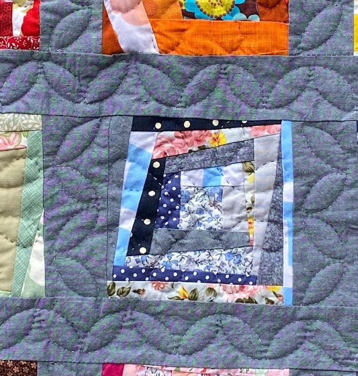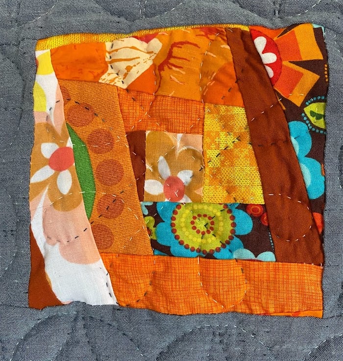 Wonky log cabin blocks has long been on my list of blocks to try out and they were just as much fun as I had imagined! Due to the recent use of rainbow images to support the NHS, I decided to use nine colour blocks, including the rainbow colours in their correct order. I have around 20 plus years of fabric scraps from all the projects I have ever worked on and many of these are included in these blocks, so its a bit of a celebration of my years of sewing and of repurposing fabrics rather than throwing them away. The different fabrics and the hand quilting really give this mini quilt a lovely texture and its hard to resist running your fingers over it!