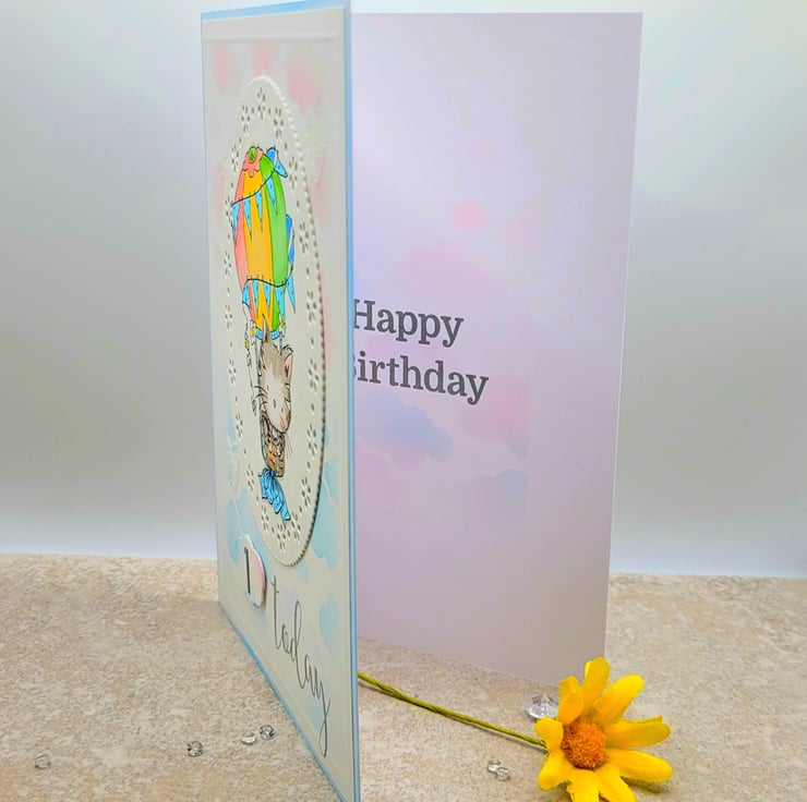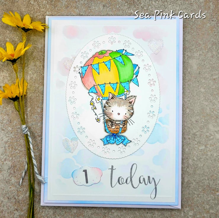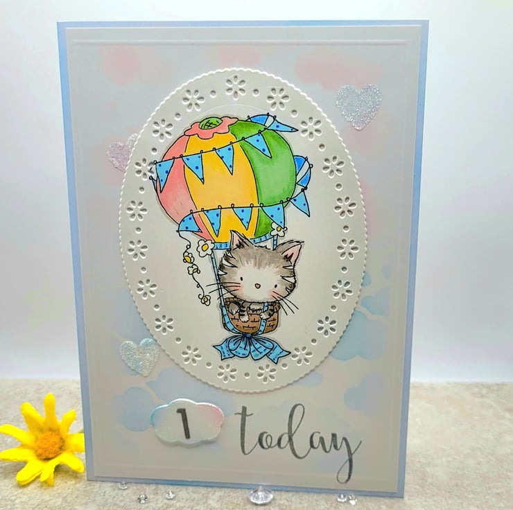 The cat in the balloon is stamped by hand onto a die cut decorative oval, which I've layered onto a stencilled sky. The appropriate age will be die cut and placed inside a cloud beside the TODAY sentiment.
