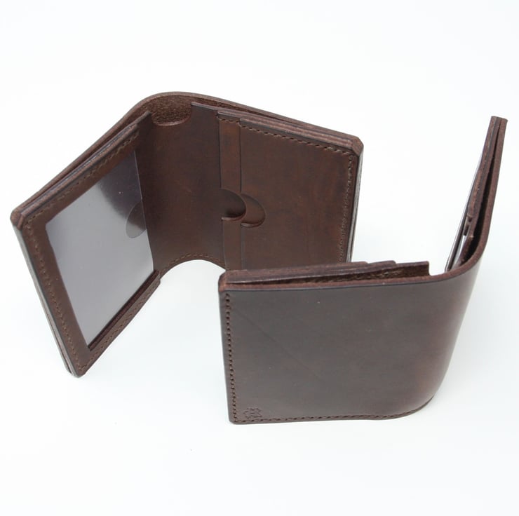 This smart brown wallet is made from quality veg-tanned leather. There are pockets for notes and cards, and a special window pocket made from see-thru plastic for your ID card. The wallet is hand-stitched, which means it is made to last – I have used traditional saddle stitch which is really strong. The wallet edges have been carefully trimmed and burnished, which results in a lovely smooth finish.