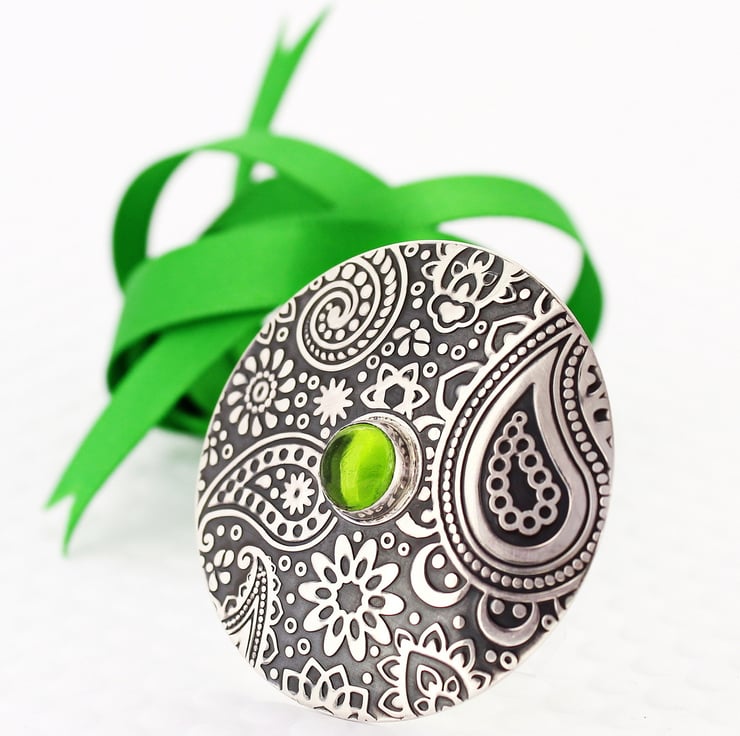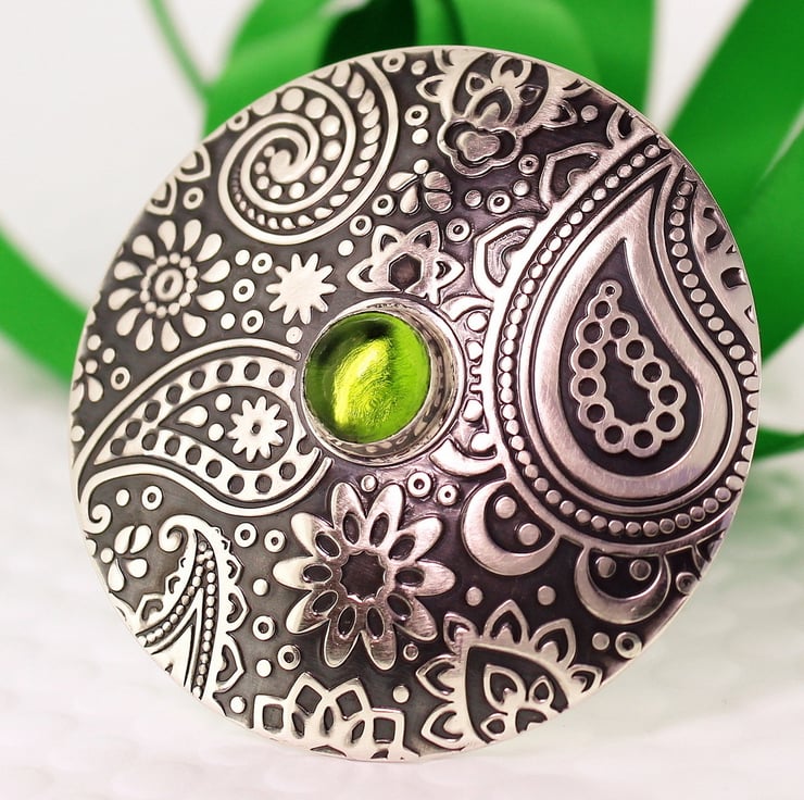 This Paisley pattern brooch has been designed and handmade by us in our workshop in Yorkshire. It is made from sterling silver and features one of our wonderful 8mm lab. grown Peridot Quartz gemstones set in a silver bezel. We designed our own Paisley pattern, which has been deeply embossed into the silver to create a beautiful surface pattern. The brooch is slightly domed and measures 45mm in diameter, with a '925' sterling silver mark and our maker's mark 'J&DF' stamped into the silver on the back of the brooch.
