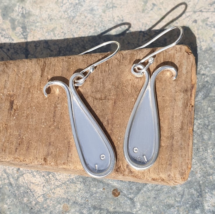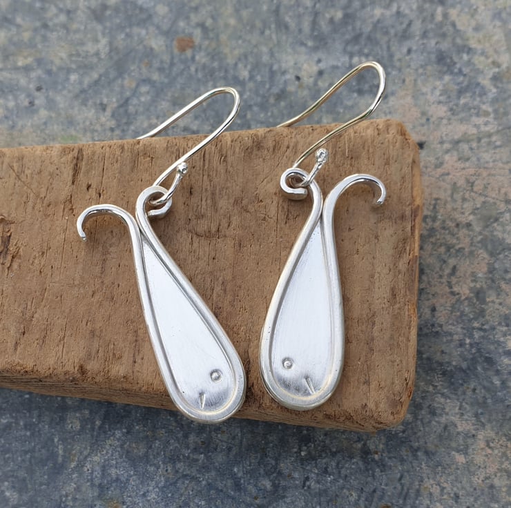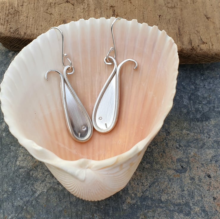 These smiley fish earrings are handmade from sterling silver wire which has been shaped to form the outline of the body and tail. They have been backed with sterling silver sheet which has a tiny stamped mouth and eye. They have a lightly brushed finish and hang from hand made sterling silver wires. The fish measure approx 30mm by 11mm with an overall drop of 45mm.