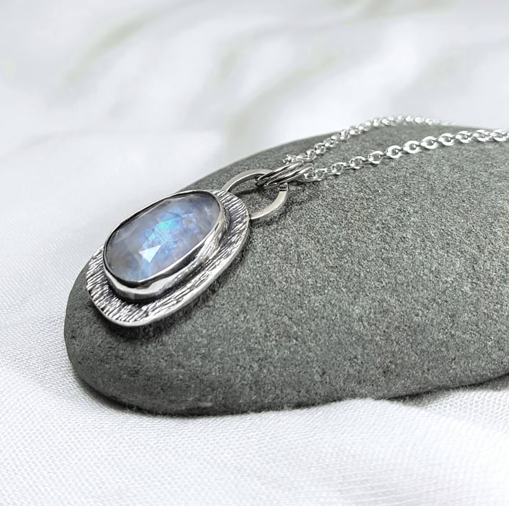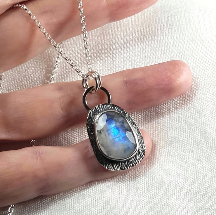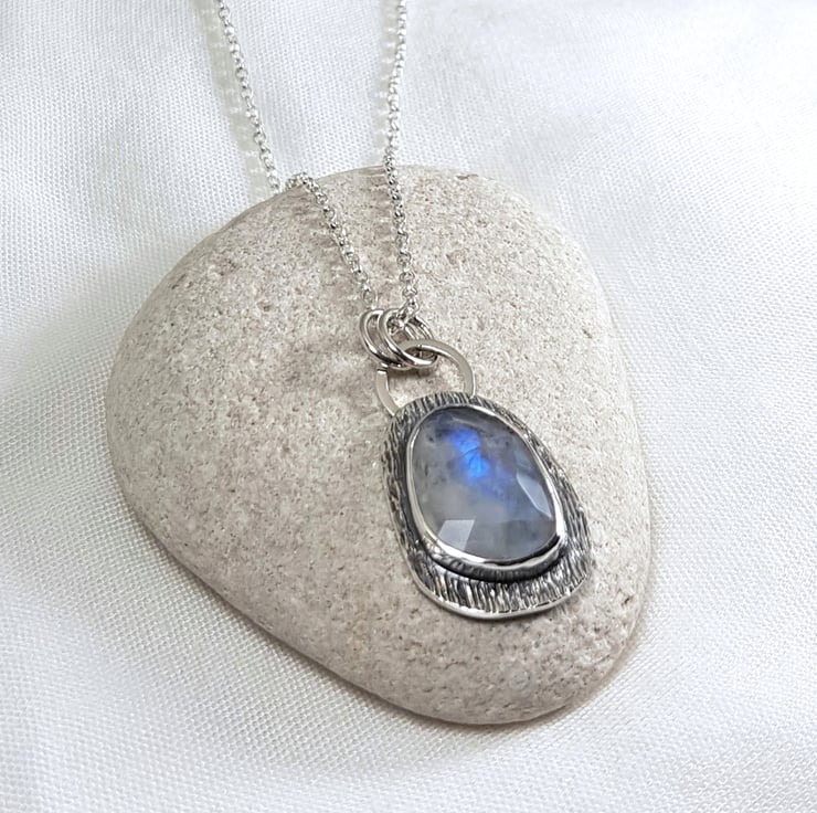 The rose cut, freeform blue moonstone contains various inclusions and imperfections which make it totally unique. The photos show the iridescence at various angles and when you catch that gorgeous blue flash it's magical!