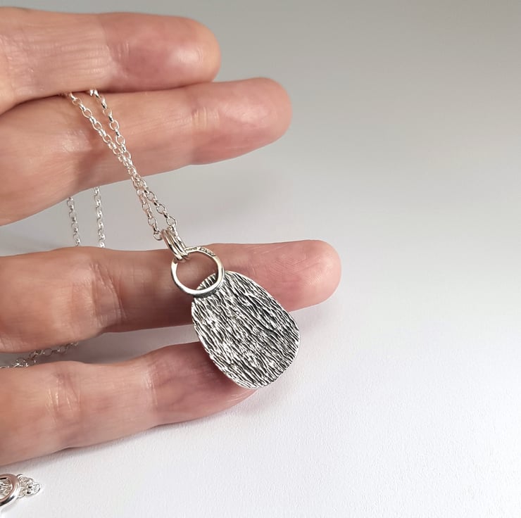 This statement piece features a hand textured tree bark design on the back plate and rear of the pendant which has been oxidised (darkened) to enhance the detail.