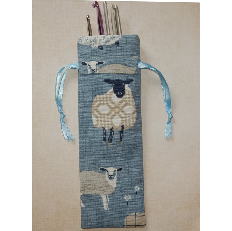 This handy little pouch will hold all your crochet hooks, or similar items. It measures 8.75 x 3 inches and is made from a delightful sheep themed fabric, with a toning plaid brushed cotton lining. It has a drawstring fastening to hold the contents inside.