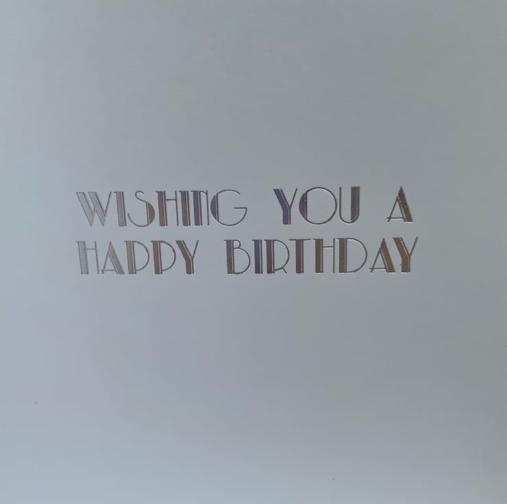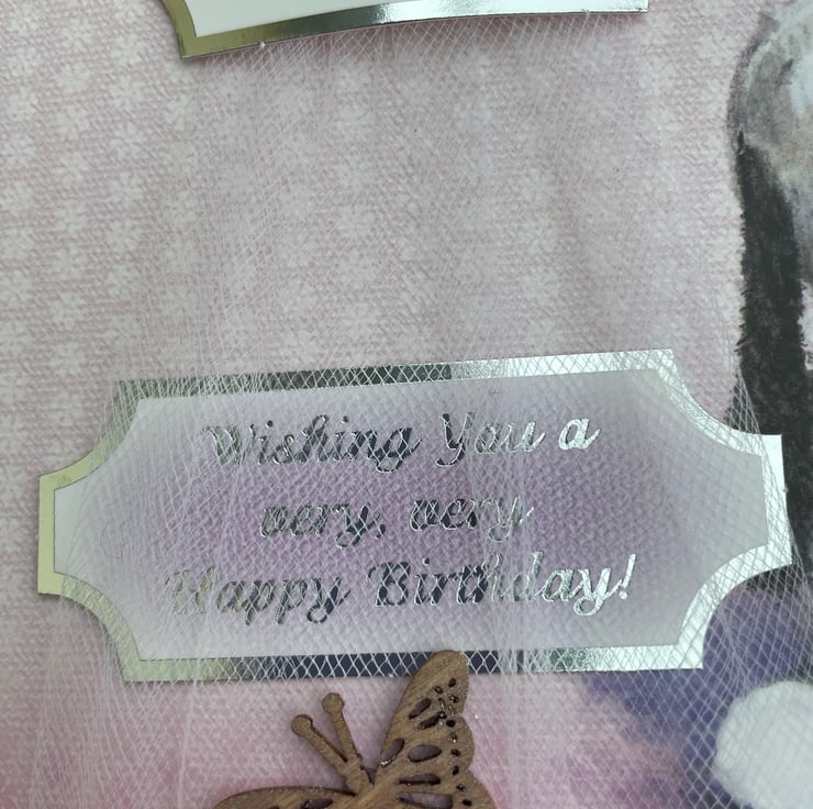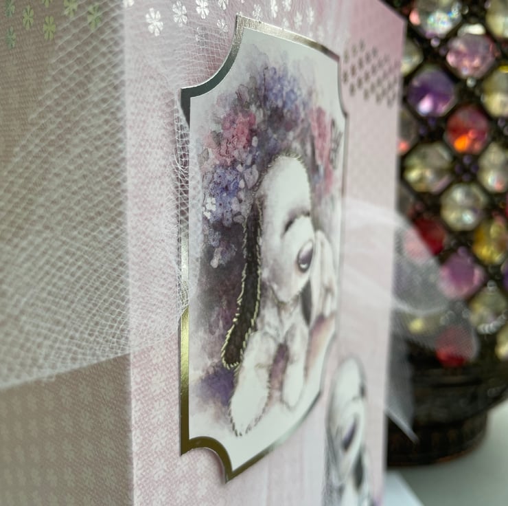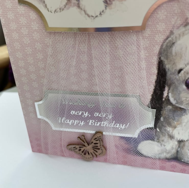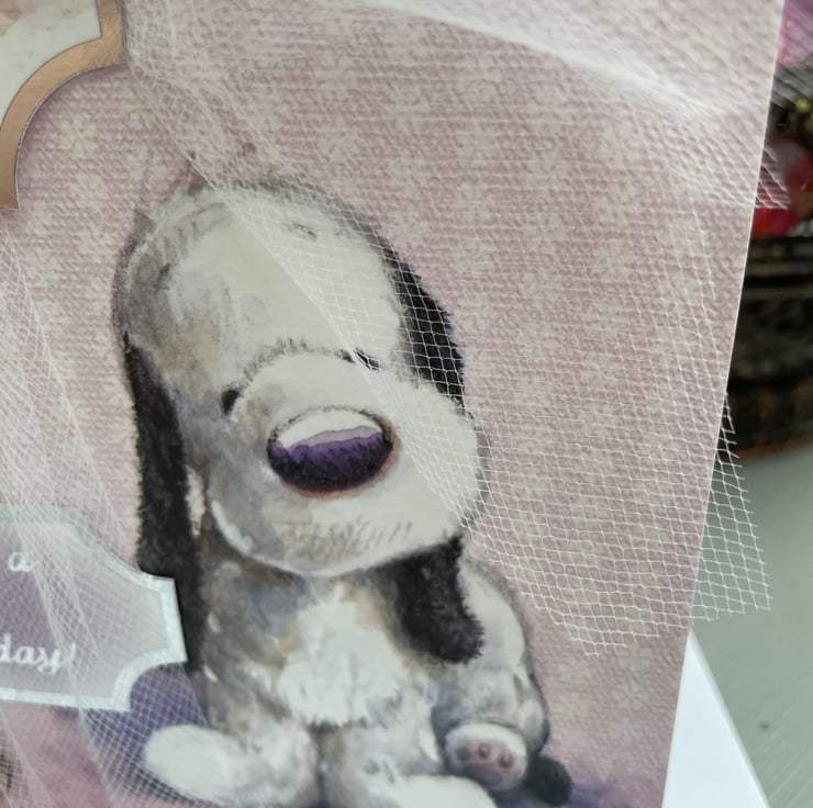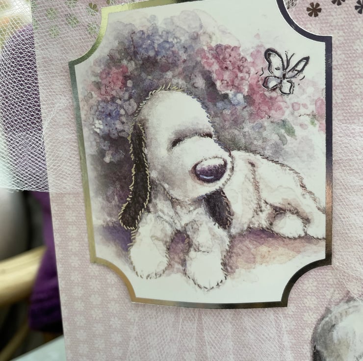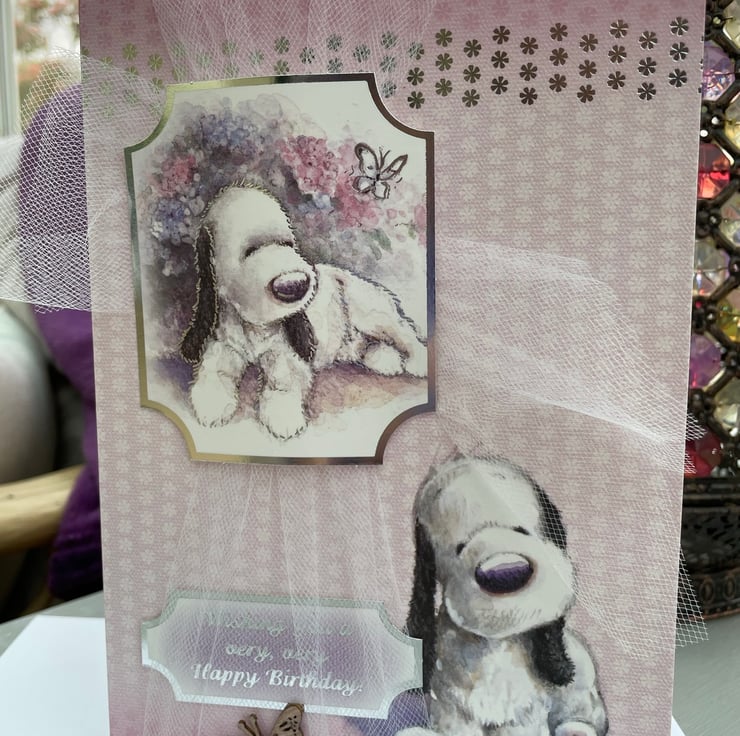 A beautiful birthday card with the cutest dog featuring on the front. This A5 sizes card is in the lovliest of pale pink with white and silver daisies. It features the cutest of pups sitting in the corner. It is decorated with white tulle net ribbon tied longways round the card. A matching topper with the same dog sits on the ribbon and is decorated with flowers and a butterfly. A matching greeting says Wishing you a very, very happy birthday. A wooden butterfly with rose gold wax colouring is used to finish the design. Inside the card has an insert which says Wishing you a happy birthday.