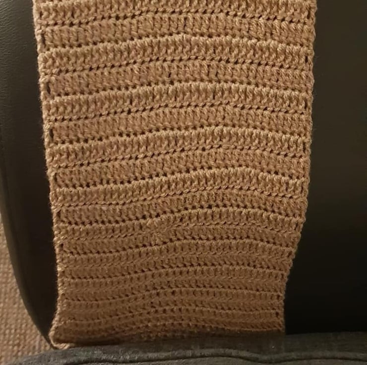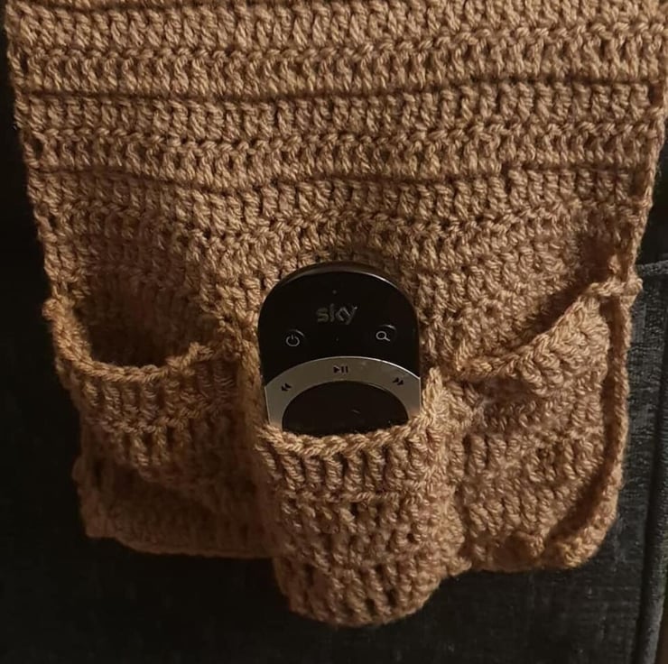 For sale is a hand made crochet TV remote holder. I use wool and crochet this lengthy item. One end goes over the sofa and tucks down the side of the sofa cushion. The other end goes over the side / arm of the sofa and hangs down the side and has three pockets so remote controls / phones etc can be stored in these pockets. The item is very stretchy so give it a good tug when tucking it under the sofa cushion.