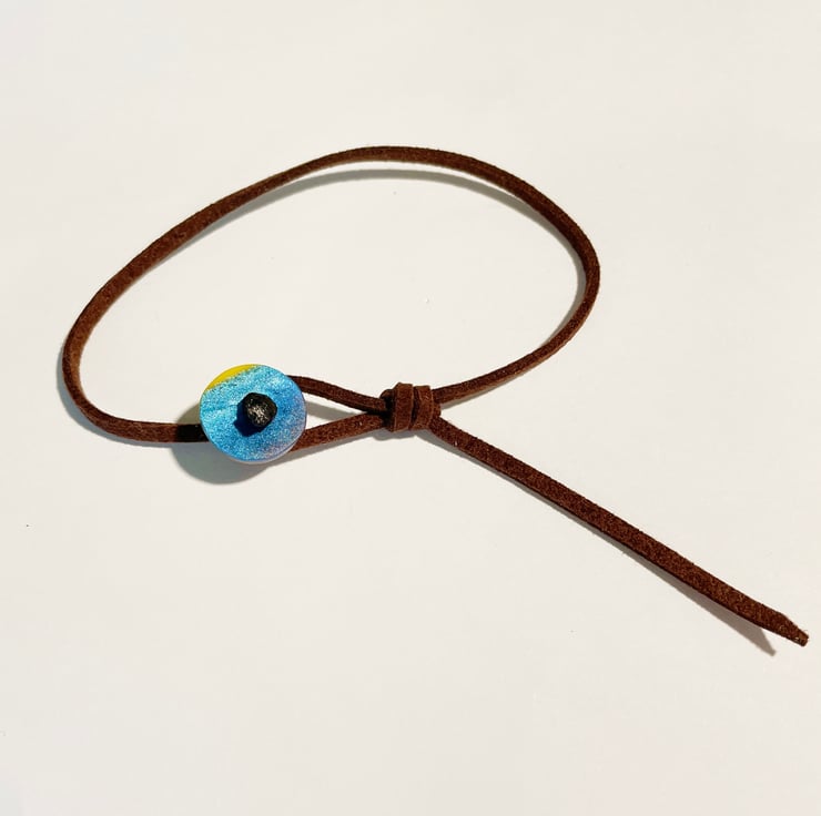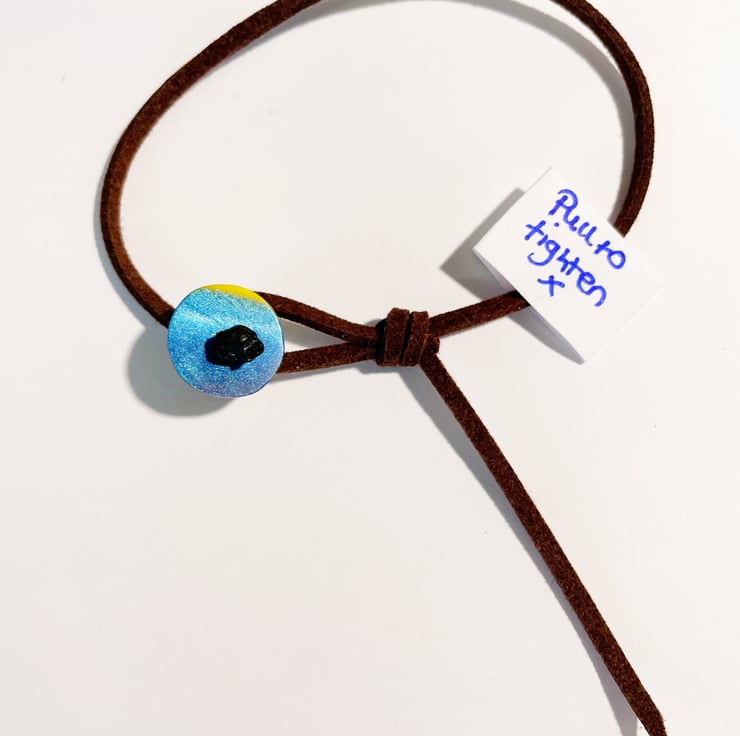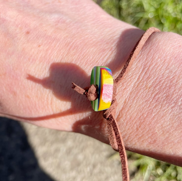 The bracelet cord is faux suede in either light or dark brown. The bracelet is approx 20cms long and is adjustable using a slip knot.