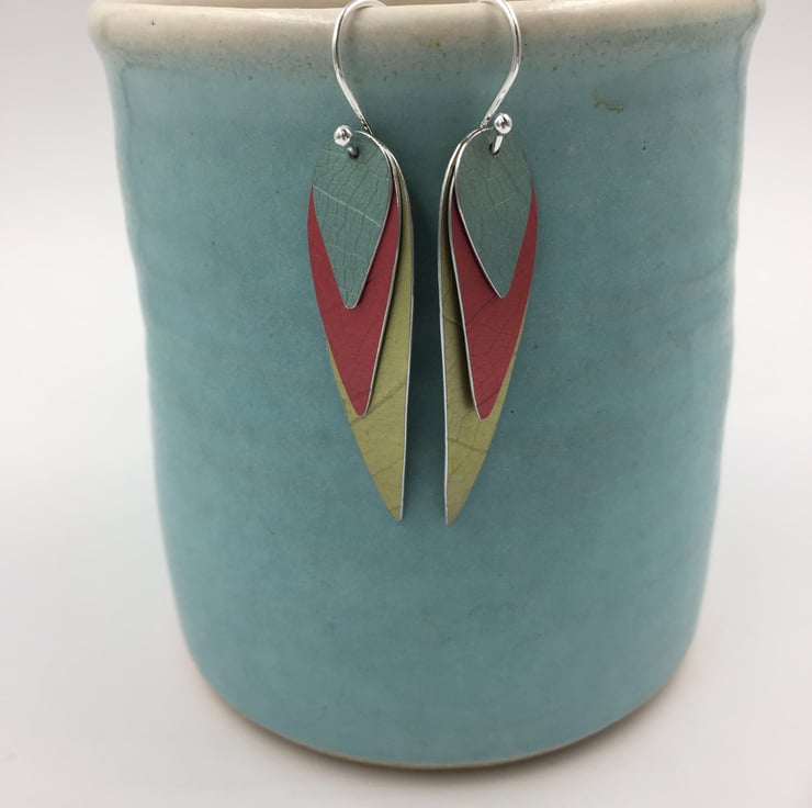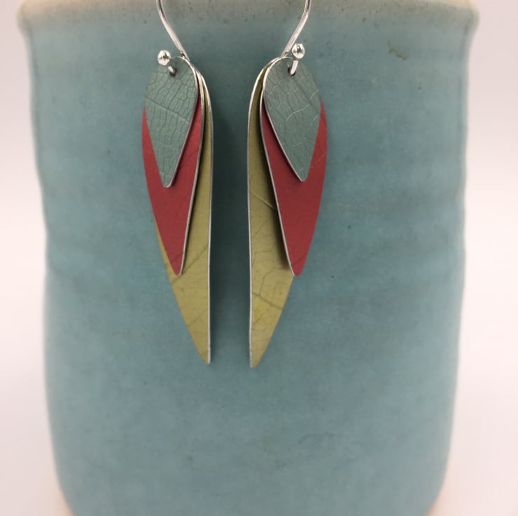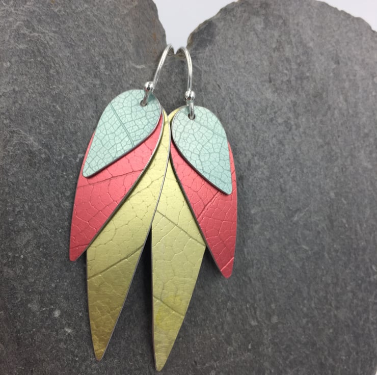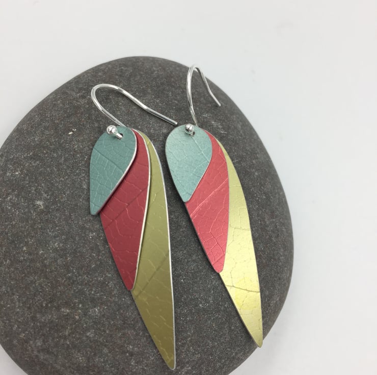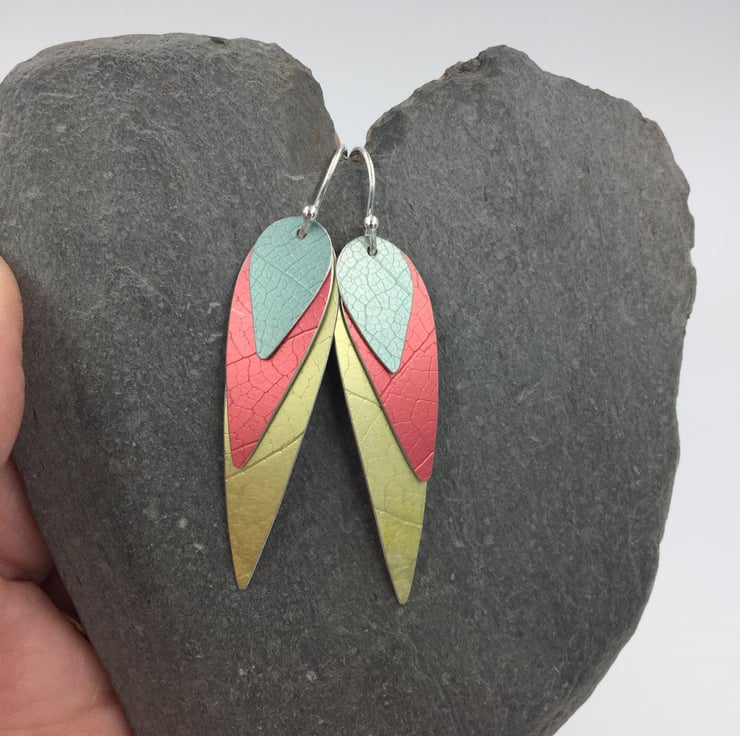 3 layers of textured and hand dyed aluminium make these fun colourful ‘parrot wing’ earrings!