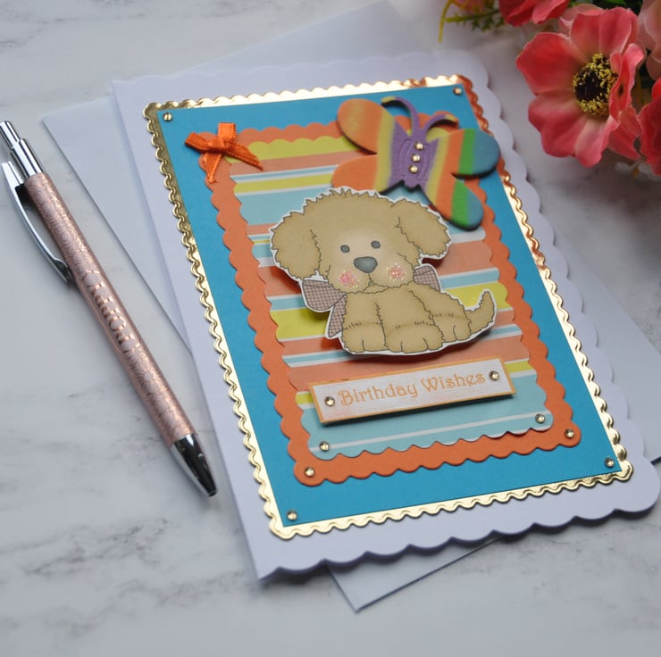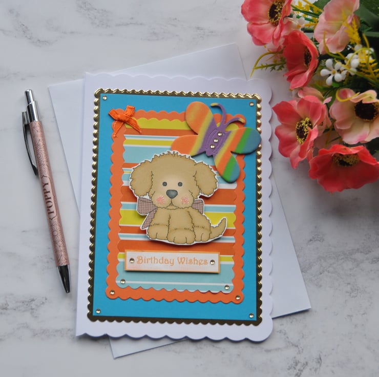 The sentiment greeting is also 3D and says Birthday Wishes. The card is finished with a 3D butterfly in rainbow colours, an orange ribbon bow, lots of gems, a touch of glitter, and lots of foiling.