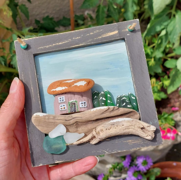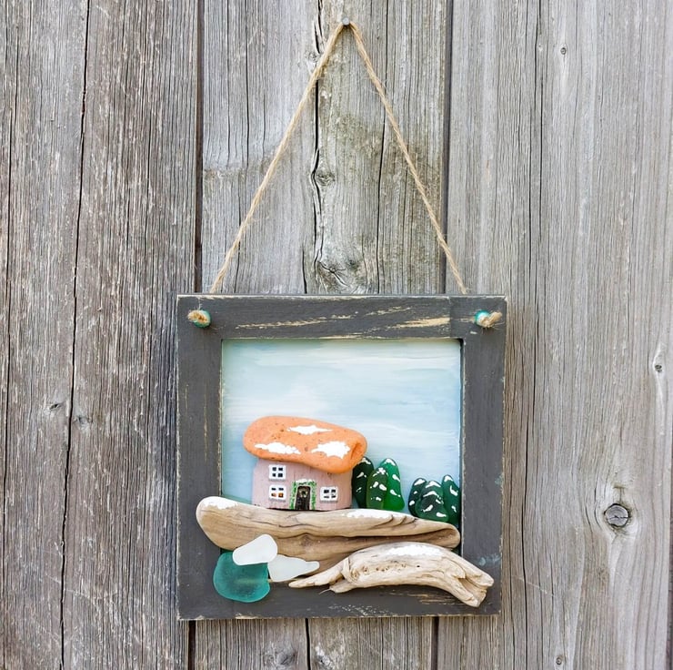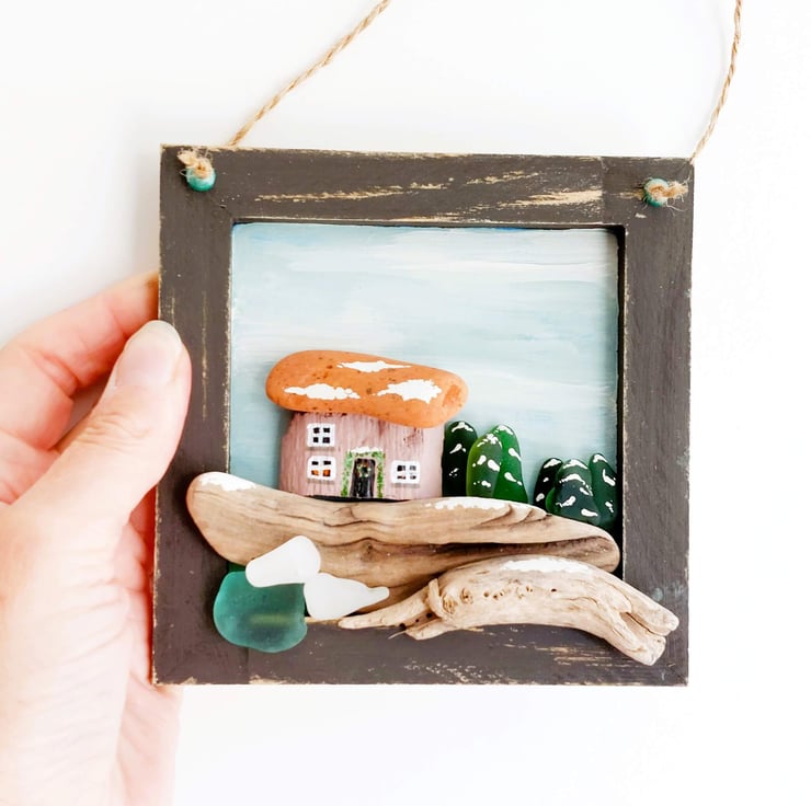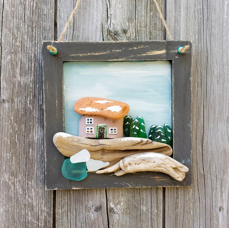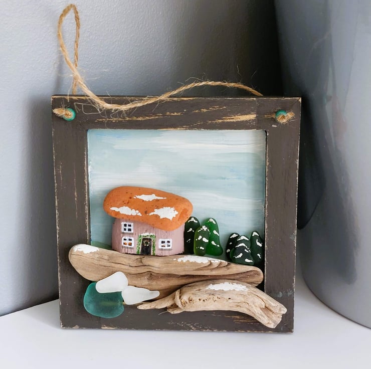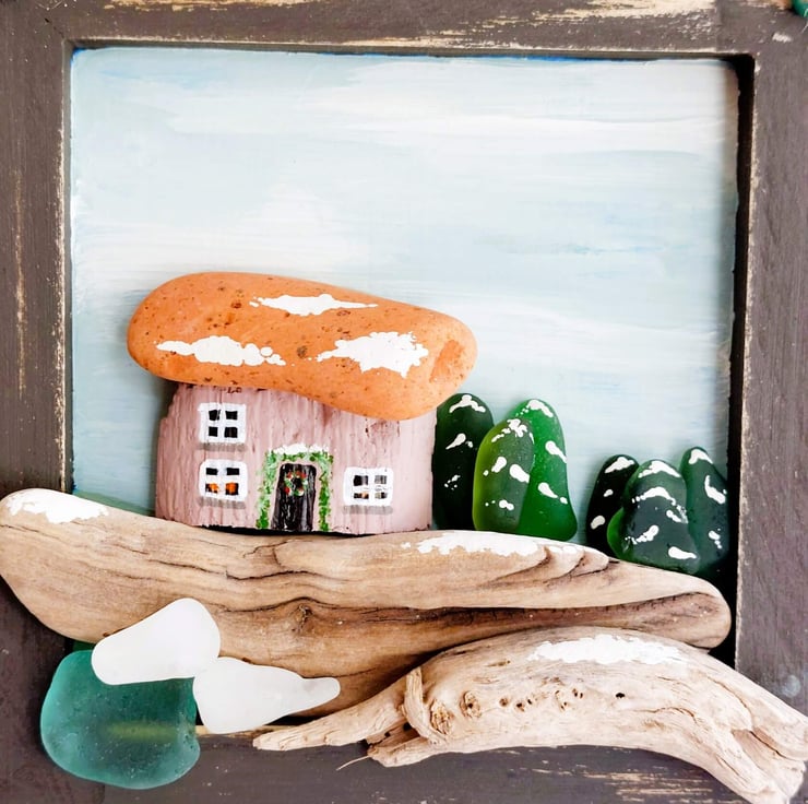 The wall art is made from a square wooden box frame, with the outer edge painted brown and the inner section in pale blue. It features driftwood, sea glass, and beachcombed terracotta as embellishments. The driftwood is painted in a lovely dusky pink to form a seaside cottage with a terracotta roof. Windows and doors are painted on, and white paint is used to depict snow on the roof. Green sea glass pieces form a forest to the right of the house, accented with snow. Driftwood with sea glass beneath it completes the scene.