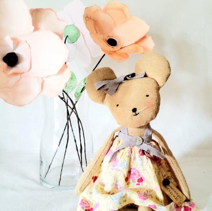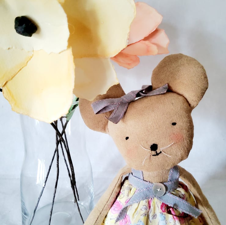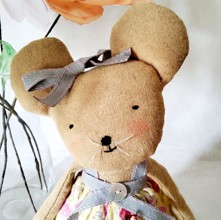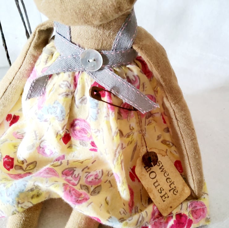 Sweetie Mouse is made from coffee and cinnamon dyed Osnaburg fabric, with embroidered features and vintage linen thread whiskers. She is wearing a little cotton dress trimmed with ribbon and a mother of pearl button. She has a little hand printed tag with her name on it,finished with a rusty bell and attached with a rusty safety pin.