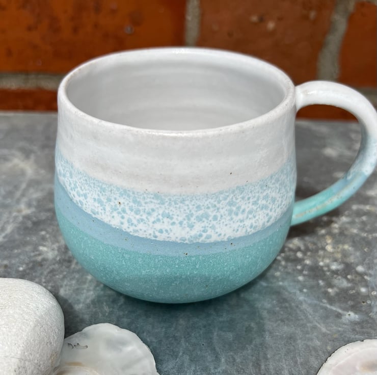 This is a hand thrown pottery mug with layered colours - a glossy white inside and the same white outside dipped into a beautiful Peacock Green and Duck Egg blue! Pulled handle (in case you’ve watched Pottery Throwdown)!