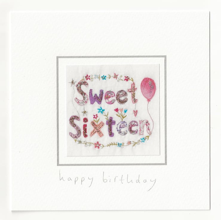 This pretty Sweet Sixteen card is printed from an original embroidery created by Suzanne Hooson. It is hand finished with glitter for an added sparkle for someone special.