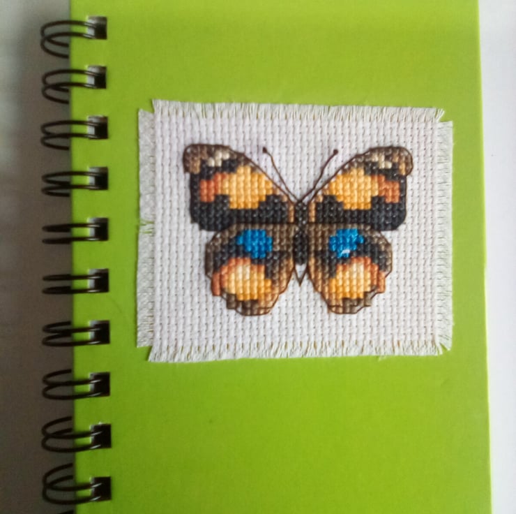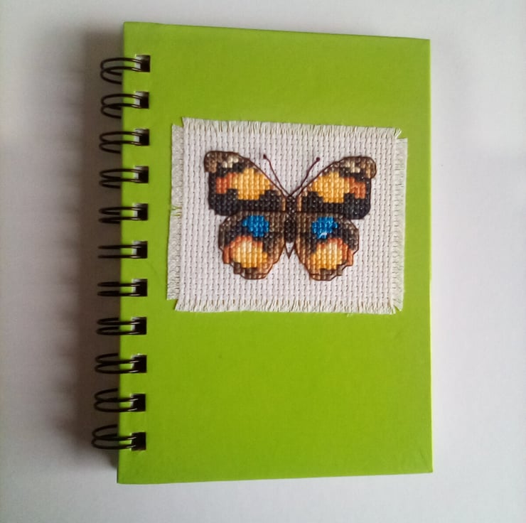 Hand stitched cross stitch butterfly spiral bound notebook.