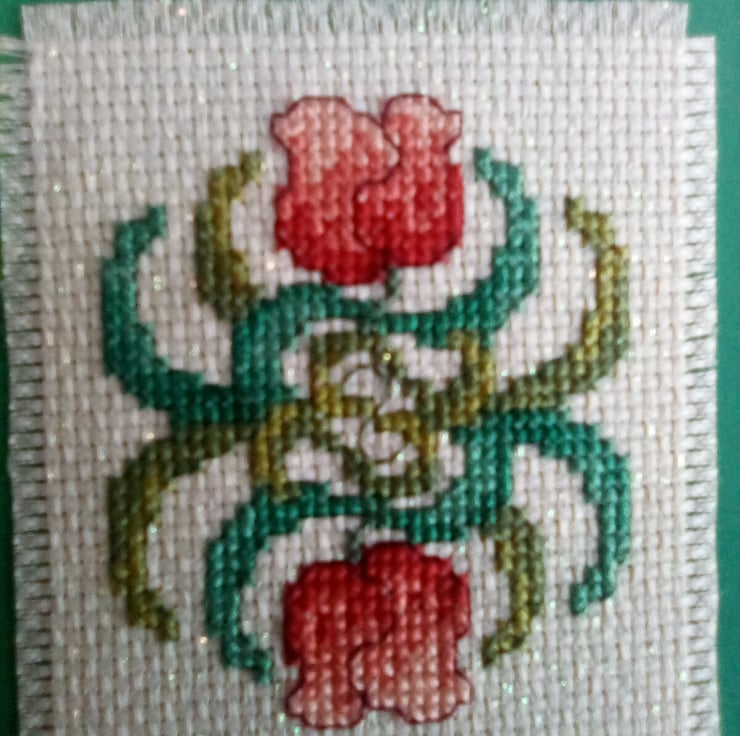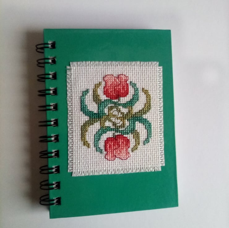 The book is a lovely shade of deep teal. I have mounted on to it one of my hand stitched cross stitch pieces. This time it is of Art Deco flowers in shades of pink and teal. The fabric has silver thread running through it.