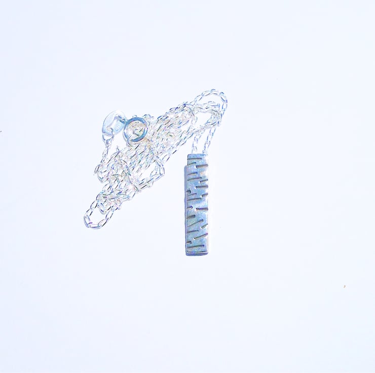 The pendant measures approximately 19.2 x 4.2 x 1.3 mm and is hung by a soldered half jump ring from an 18 inch sterling silver necklace.