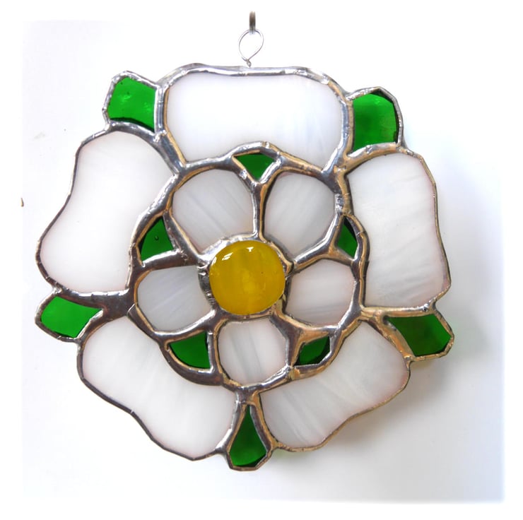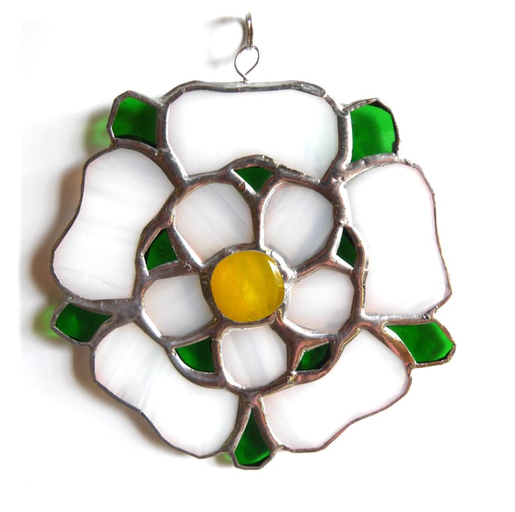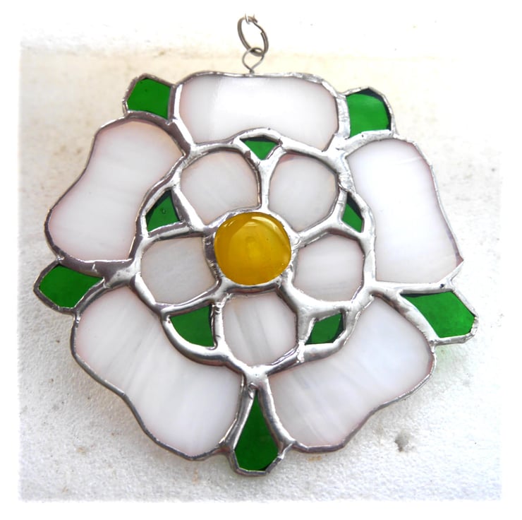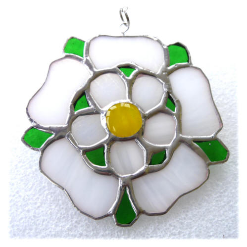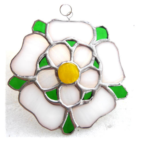 The rose is the classic Yorkshire / Lancashire design with two rings of 5 white glass petals and 2 rings of little green leaves