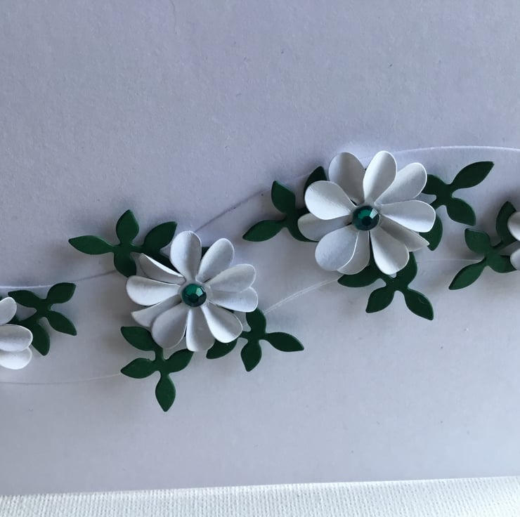 White flowers with teal coloured centres on a white band. Although white on white, it really stands out.