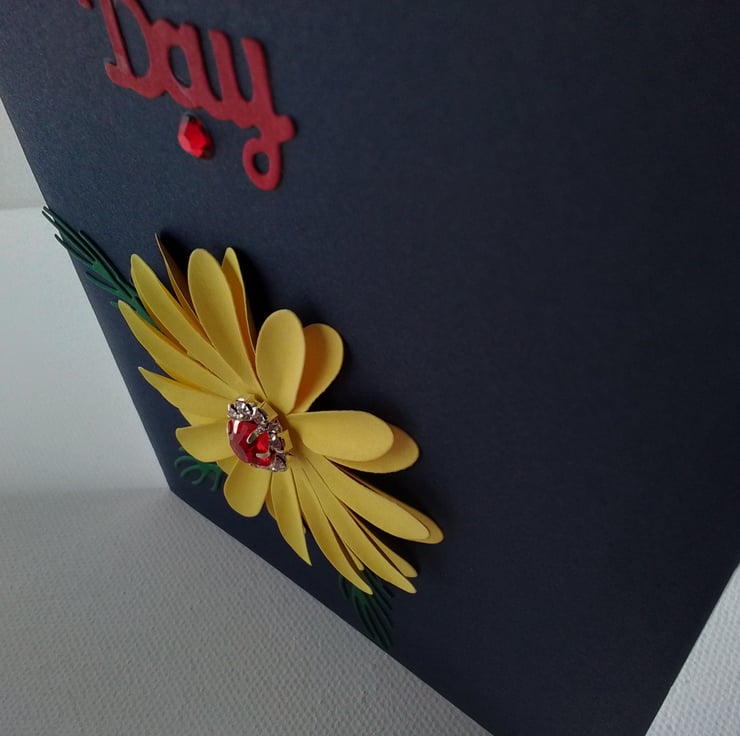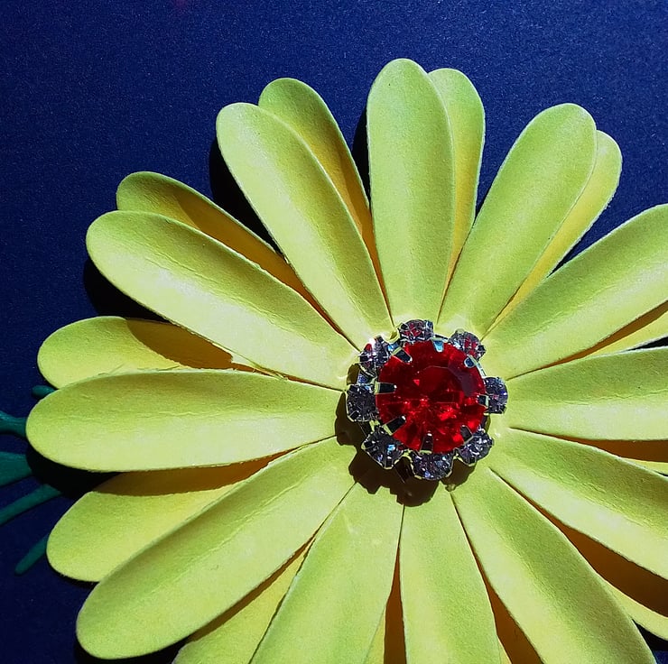 A bright, summery handmade flower with a striking red and silver gemstone centre.
